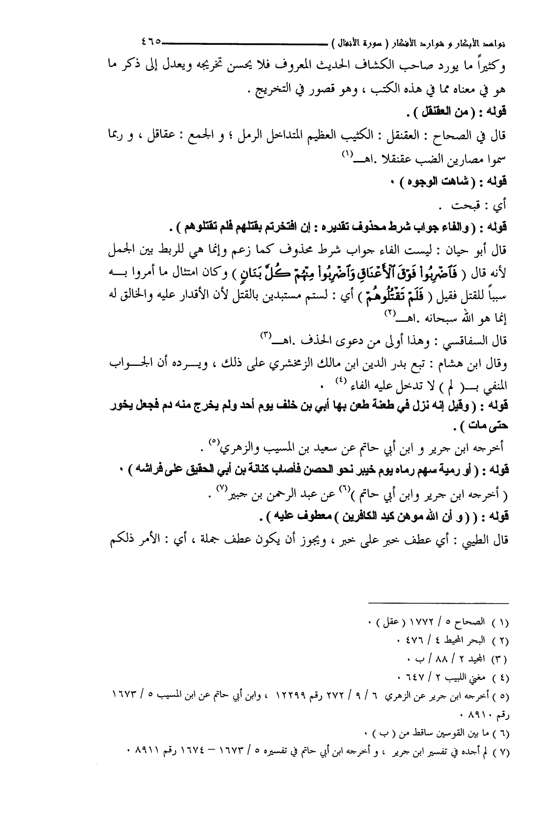 قال أبو حيان: ليست الفاء جواب شرط محذوف كما زعم وإنما هي للربط بين الجمل لأنه قال (فَاضْرِبُوا فَوْقَ الْأَعْنَاقِ وَاضْرِبُوا مِنْهُمْ كُلَّ بَنَانٍ) وكان امتثال ما أمروا به سبباً للقتل فقيل (فَلَمْ تَقْتُلُوهُمْ) أي: لستم مستبدين بالقتل لأن الإقدار عليه والخالق له إنما هو الله سبحانه. اهـ