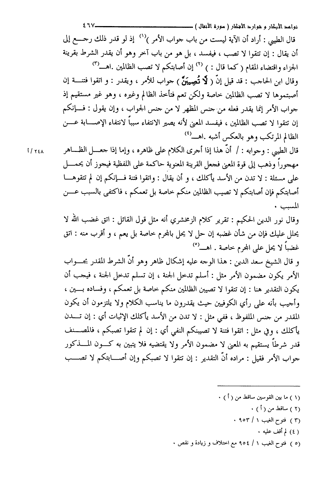 قال الطَّيبي: أراد أن الآية ليست من باب جواب الأمر إذ لو قدر ذلك رجع إلى أن يقال: إن تتقوا لا تصب، فيفسد، بل هو من باب آخر وهو أن يقدر الشرط بقرينة الجزاء واقتضاء المقام كما قال: إن أصابتكم لا تصب الظالمين. اهـ