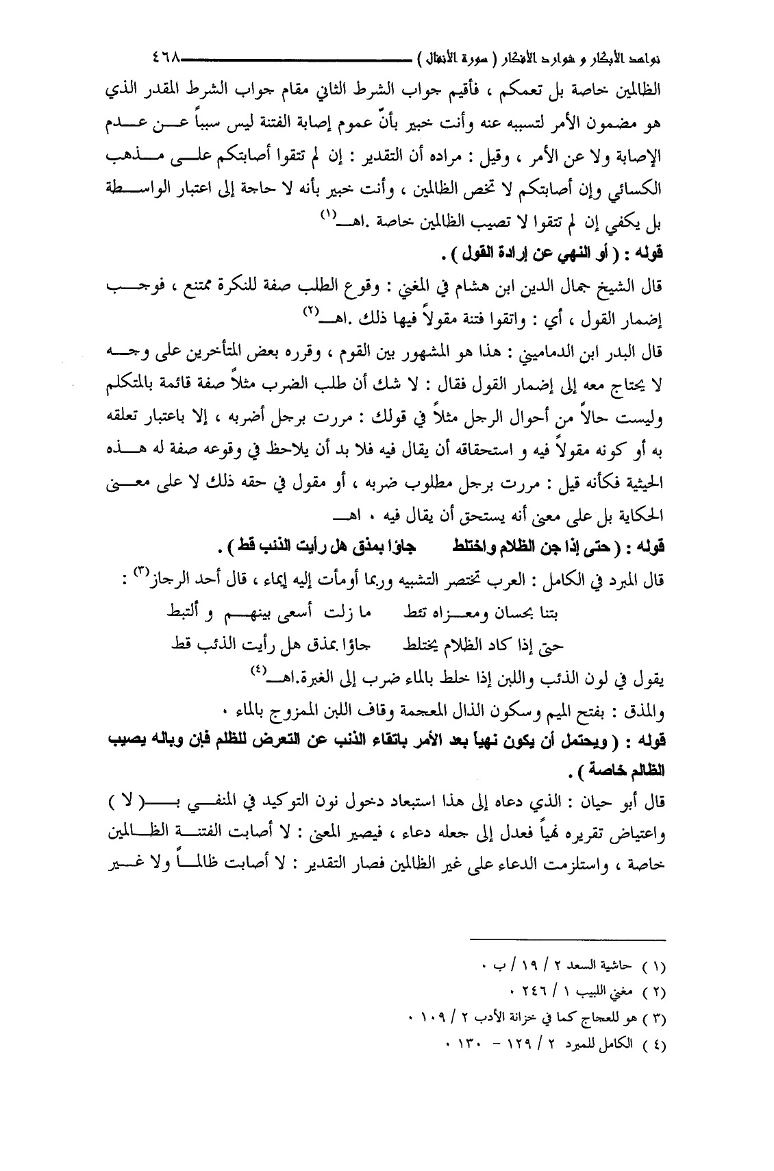 الظالمين خاصة بل تعمكم، فأقيم جواب الشرط الثاني مقام جواب الشرط المقدر الذي هو مضمون الأمر لتسببه عنه وأنت خبير بأنَّ عموم إصابة الفتنة ليس سبباً عن عدم الإصابة ولا عن الأمر، وقيل: مراده أن التقدير: إن لم تتقوا أصابتكم على مذهب الكسائي وإن أصابتكم لا تخص الظالمين، وأنت خبير بأنه لا حاجة إلى اعتبار الواسطة بل يكفي إن لم تتقوا لا تصيب الظالمين خاصة. اهـ