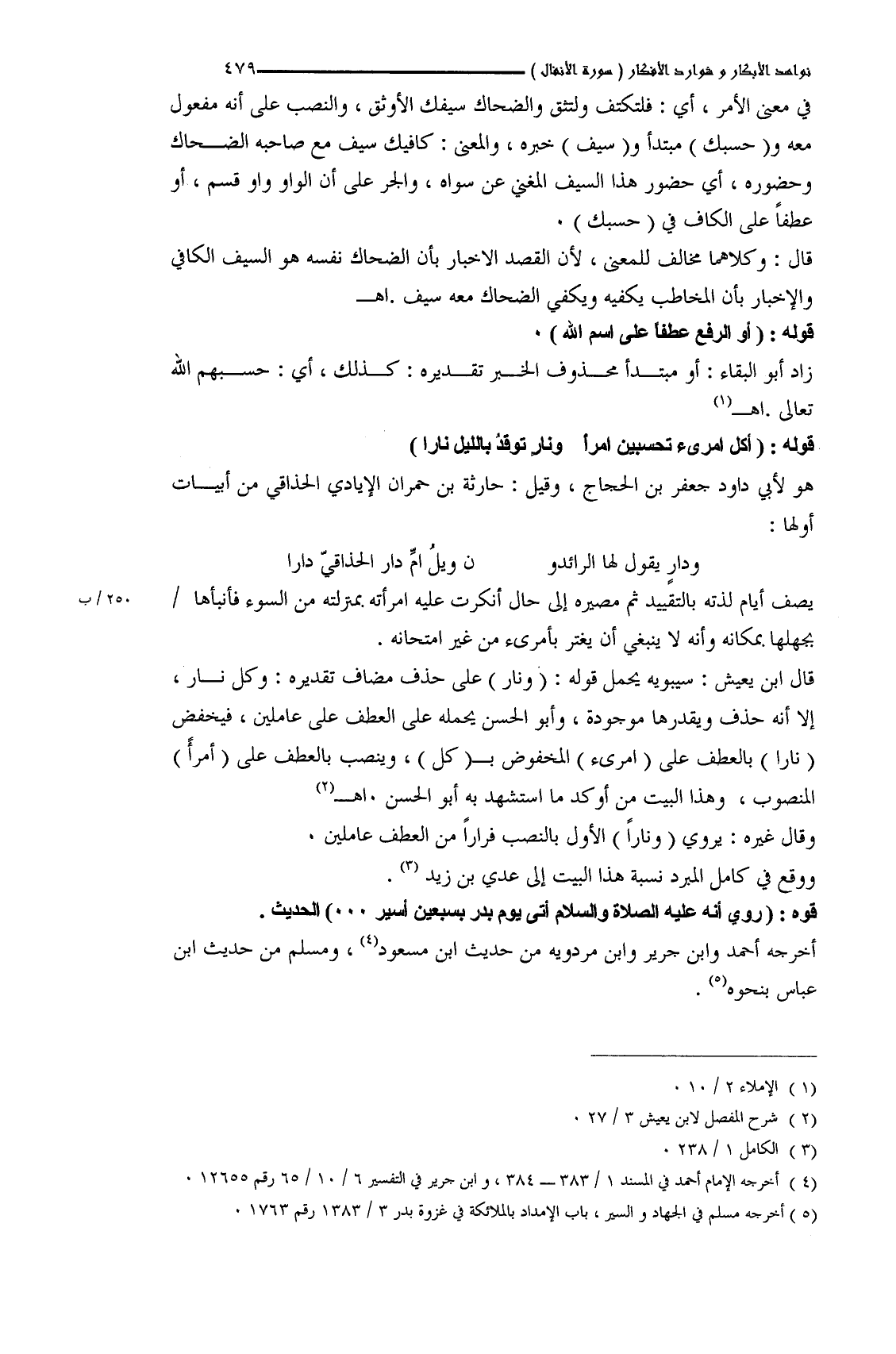 في معنى الأمر، أي: فلتكتف ولتثق والضحاك سيفك الأوثق، والنصب على أنه مفعول معه و (حسبك) مبتدأ و (سيف) خبره، والمعنى: كافيك سيف مع صاحبه الضحاك وحضوره، أي حضور هذا السيف المغني عن سواه، والجر على أن الواو واو قسم، أو عطفاً على الكاف في (حسبك).