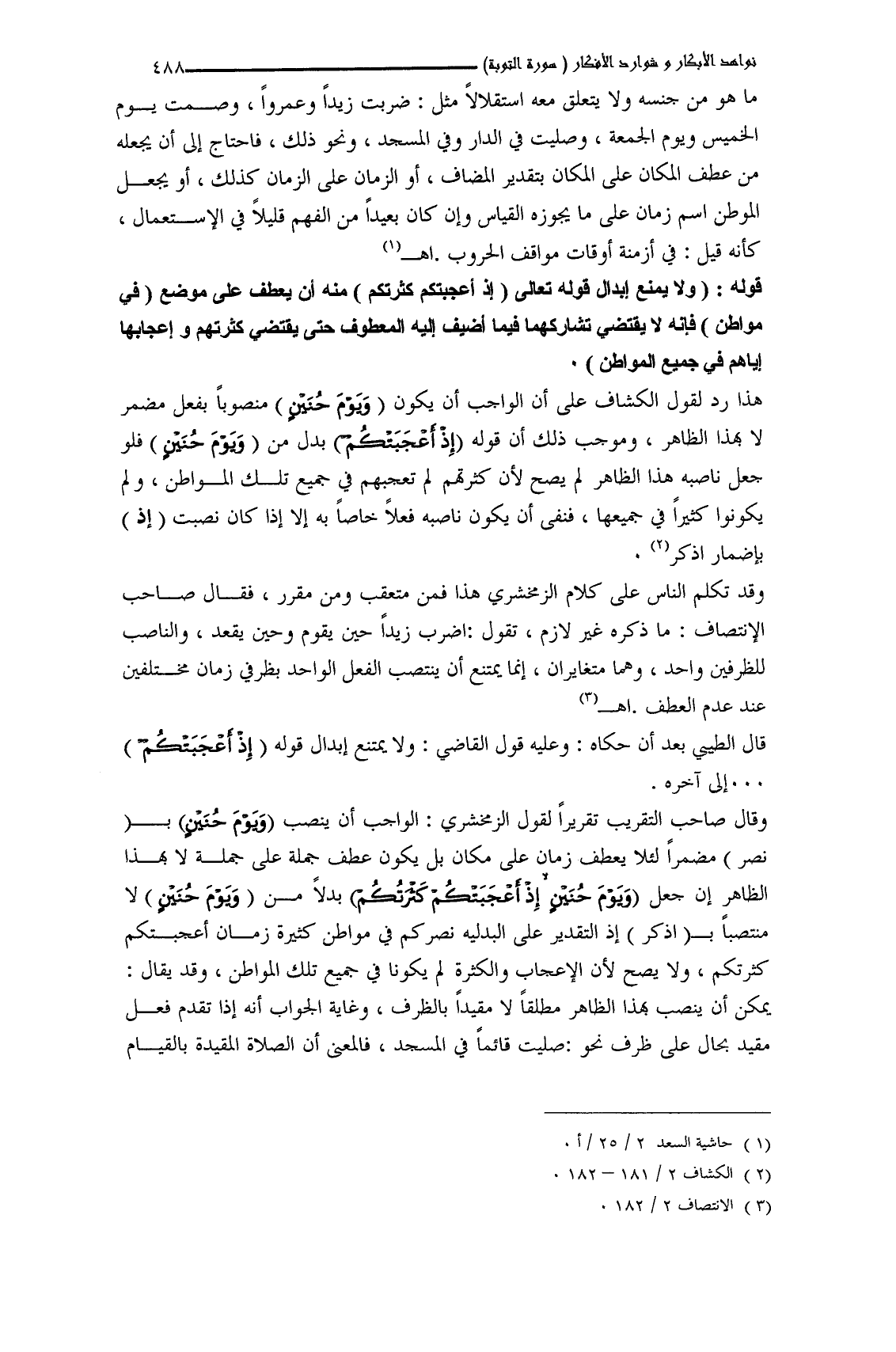 هذا ردٌّ لقول الكشاف على أن الواجب أن يكون (وَيَوْمَ حُنَيْنٍ) منصوباً بفعل مضمر لا بهذا الظاهر، وموجب ذلك أن قوله (إِذْ أَعْجَبَتْكُمْ) بدل من (وَيَوْمَ حُنَيْنٍ) فلو جعل ناصبه هذا الظاهر لم يصح لأن كثرتهم لم تعجبهم في جميع تلك المواطن، ولم يكونوا كثيراً في جميعها، فنفى أن يكون ناصبه فعلاً خاصاً به إلا إذا كان نصبت (إذ) بإضمار اذكر.