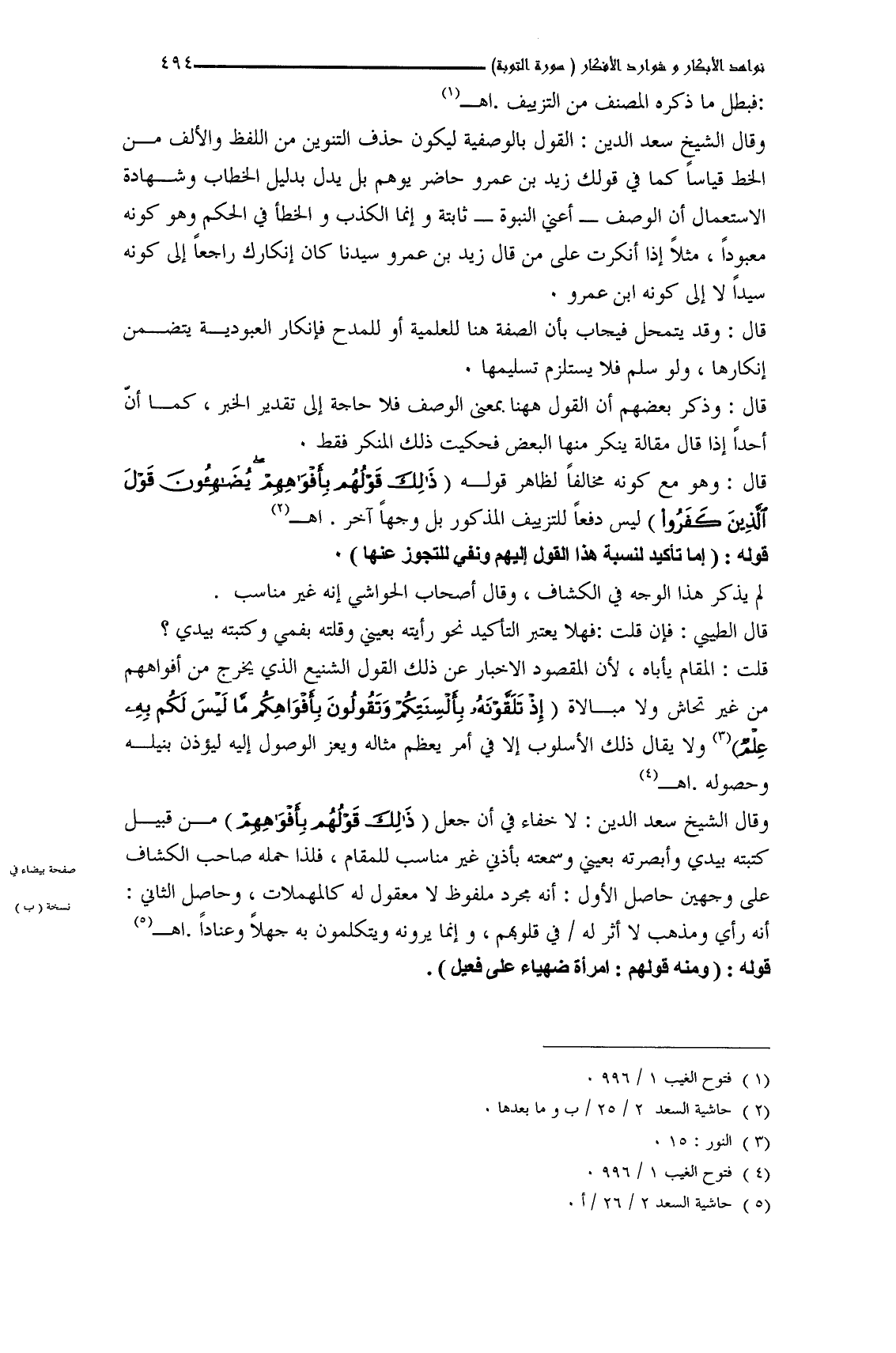 قال: وهو مع كونه مخالفاً لظاهر قوله (ذَلِكَ قَوْلُهُمْ بِأَفْوَاهِهِمْ يُضَاهِئُونَ قَوْلَ الَّذِينَ كَفَرُوا) ليس دفعاً للتزييف المذكور بل وجهاً آخر. اهـ