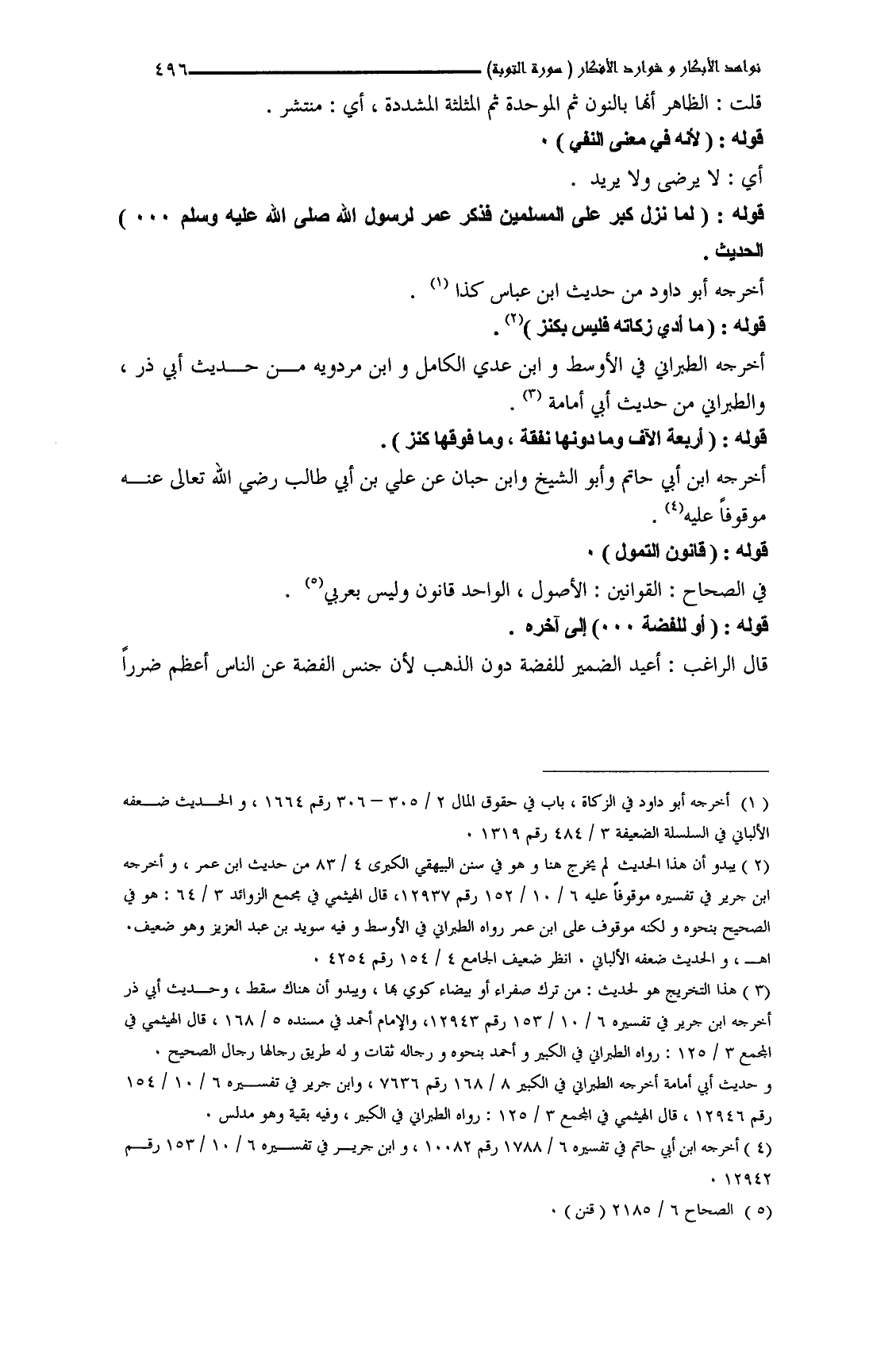 قال الراغب: أعيد الضمير للفضة دون الذهب لأن جنس الفضة عن الناس أعظم ضرراً