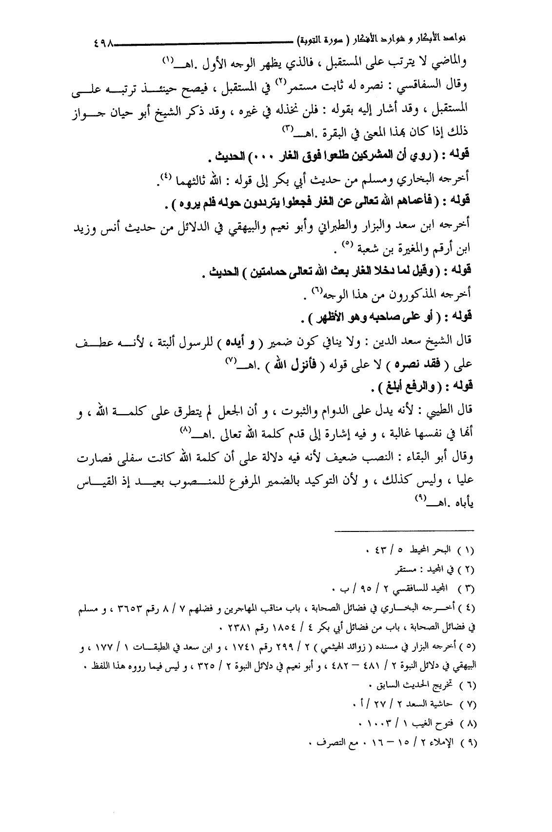 قال الشيخ سعد الدين: ولا ينافي كون ضمير (وَأَيَّدَهُ) للرسول ألبتة، لأنه عطف على (فَقَدْ نَصَرَهُ) لا على قوله (فَأَنْزَلَ اللهُ). اهـ