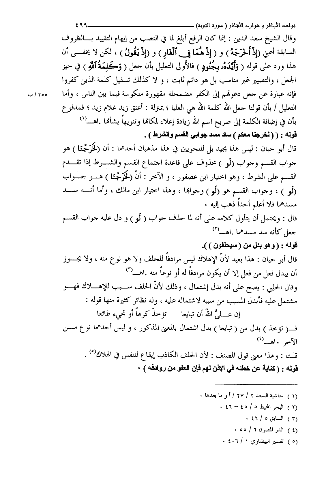 وقال الشيخ سعد الدين: إنما كان الرفع أبلغ لما في النصب من إيهام التقييد بالظروف السابقة أعني (إِذْ أَخْرَجَهُ) و (إِذْ هُمَا فِي الْغَارِ) و (إِذْ يَقُولُ)، لكن لا يخفى أن هذا ورد على قوله (وَأَيَّدَهُ بِجُنُودٍ) فالأَولى التعليل بأن جعل (وَكَلِمَةُ اللهِ) في حيز الجعل، والتصيير غير مناسب بل هو دائم ثابت، ولا كذلك تسفيل كلمة الذين كفروا فإنه عبارة عن جعل دعوتهم إلى الكفر مضمحلة مقهورة منكوسة فيما بين الناس، وأما التعليل بأن قولنا جعل الله كلمة الله هى العليا؛ بمنزلة: أعتق زيد غلام زيد؛ فمدفوع بأن في إضافة الكلمة إلى صريح اسم الله زيادة إعلاء لمكانها وتنويهاً بشأنها. اهـ