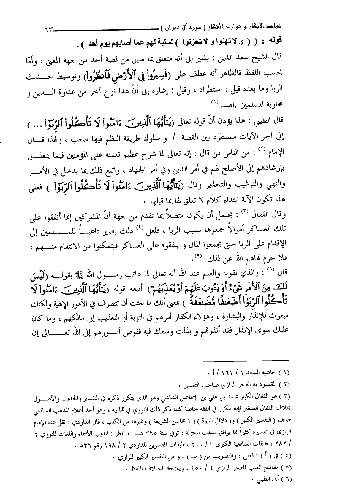 قال الطيبي: هذا يؤذن أنَّ قوله تعالى (يَا أَيُّهَا الَّذِينَ آمَنُوا لا تَأْكُلُوا الرِّبَا. . .) إلى آخر الآيات مستطرد بين القصة وسلوك طريقة النظم فيها صعب، ولهذا قال الإمام: من الناس من قال: إنه تعالى لما شرح عظيم نعمته على المؤمنين فيما يتعلق بإرشادهم إلى الأصلح لهم في أمر الدين وفي أمر الجهاد، واتبع ذلك بما يدخل في الأمر والنهي والترغيب والتحذير وقال (يَا أَيُّهَا الَّذِينَ آمَنُوا لا تَأْكُلُوا الرِّبَا) فعلى هذا تكون الآية ابتداء كلام لا تعلق لها بما قبلها.