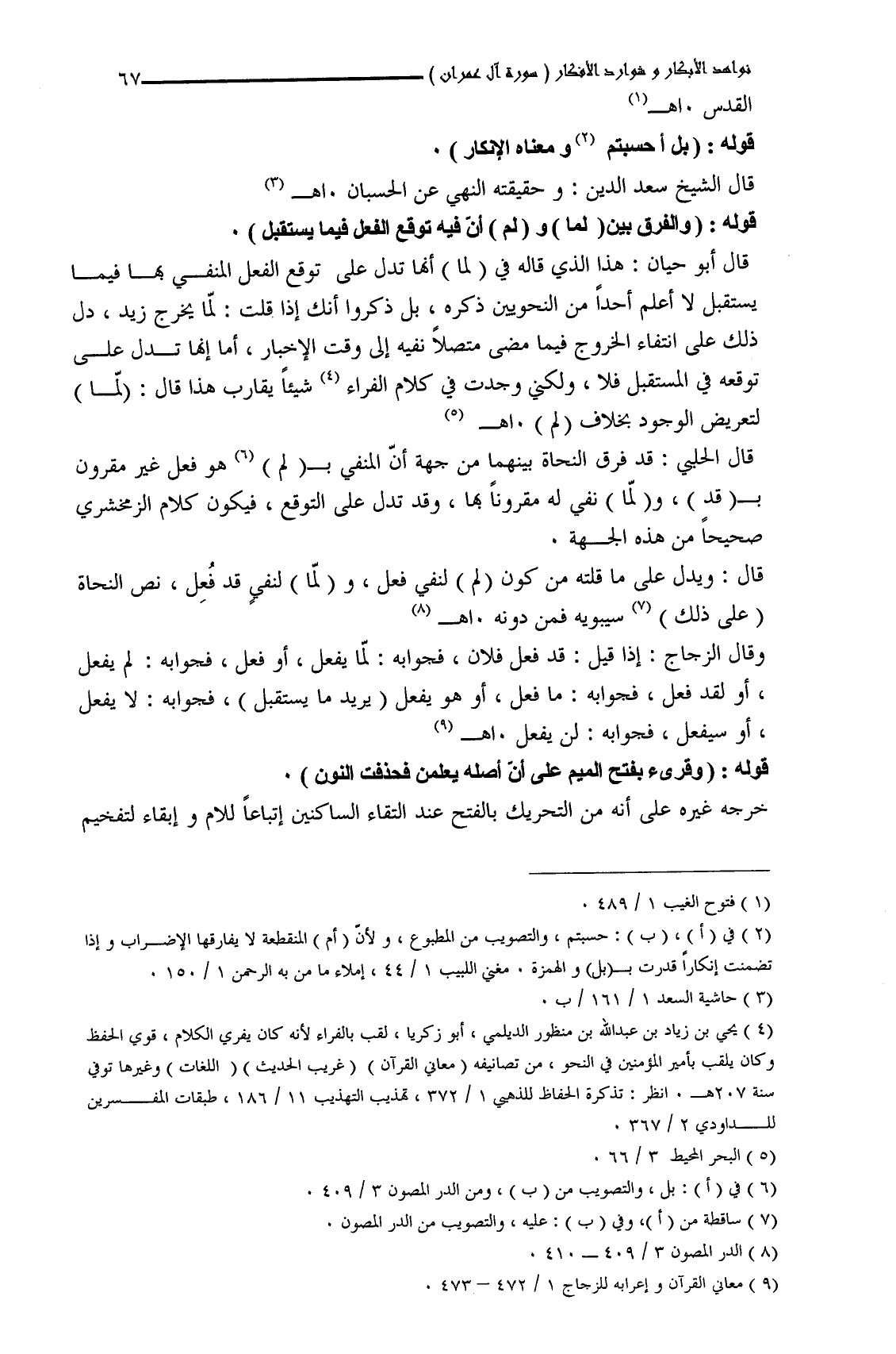 قال الحلبي: قد فرق النحاة بينهما من جهة أنَّ المنفى بـ (لم) هو فعل غير مقرون ب (قد)، و (لمّا) نفي له مقروناً بها، وقد تدل على التوقع، فيكون كلام الزمخشري صحيحاً من هذه الجهة.