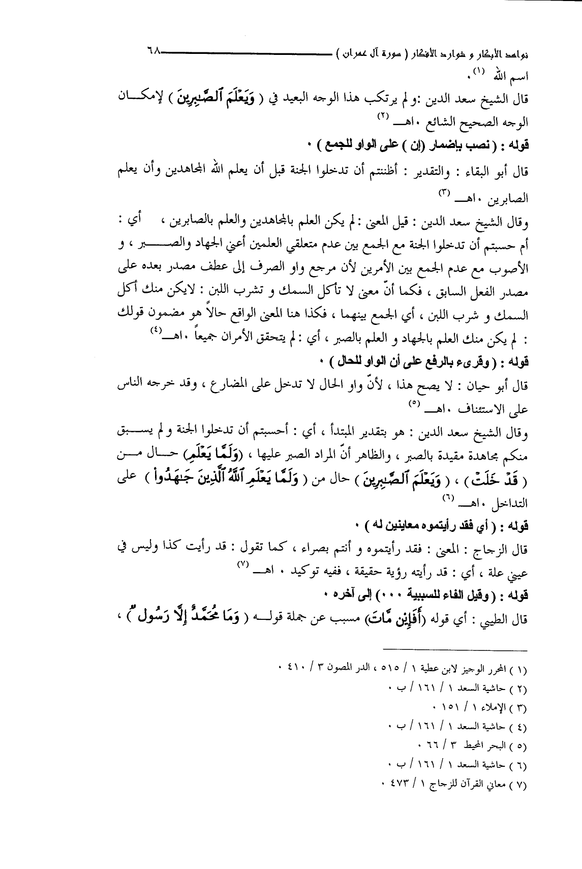 قال الشيخ سعد الدين: ولم يرتكب هذا الوجه البعيد في (وَيَعْلَمَ الصَّابِرِينَ) لإمكان الوجه الصحيح الشائع. اهـ