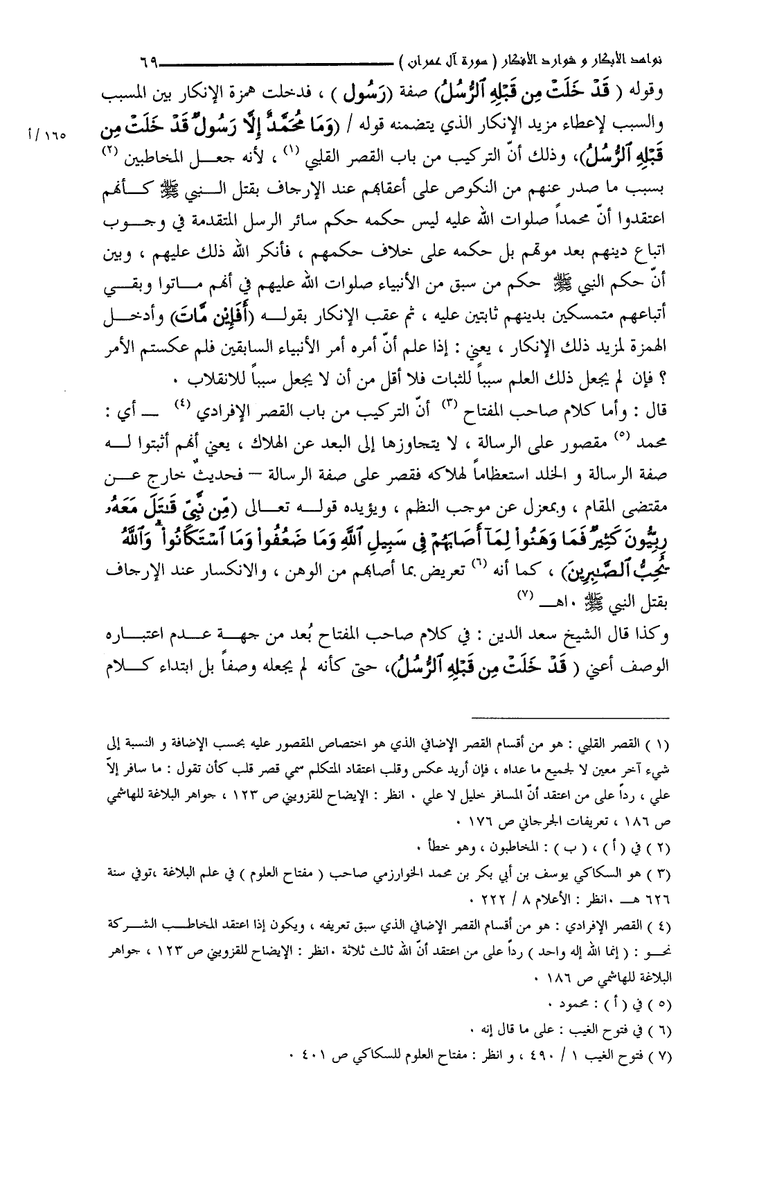 قال: وأما كلام صاحب المفتاح أنَّ التركيب من باب القصر الإفرادي -أي: محمد مقصور على الرسالة، لا يتجاوزها إلى البعد عن الهلاك، يعني أنَّهم أثبتوا له صفة الرسالة والخلد استعظاماً لهلاكه فقصر على صفة الرسالة- فحديثٌ خارج عن مقتضى المقام، وبمعزل عن موجب النظم، ويؤيده قوله تعالى (وَكَأَيِّنْ مِنْ نَبِيٍّ قَاتَلَ مَعَهُ رِبِّيُّونَ كَثِيرٌ فَمَا وَهَنُوا لِمَا أَصَابَهُمْ فِي سَبِيلِ اللهِ وَمَا ضَعُفُوا وَمَا اسْتَكَانُوا وَاللهُ يُحِبُّ الصَّابِرِينَ)، كما أنه تعريض بما أصابهم من الوهن، والانكسار عند الإرجاف بقتل النبي - صلى الله عليه وسلم -. اهـ