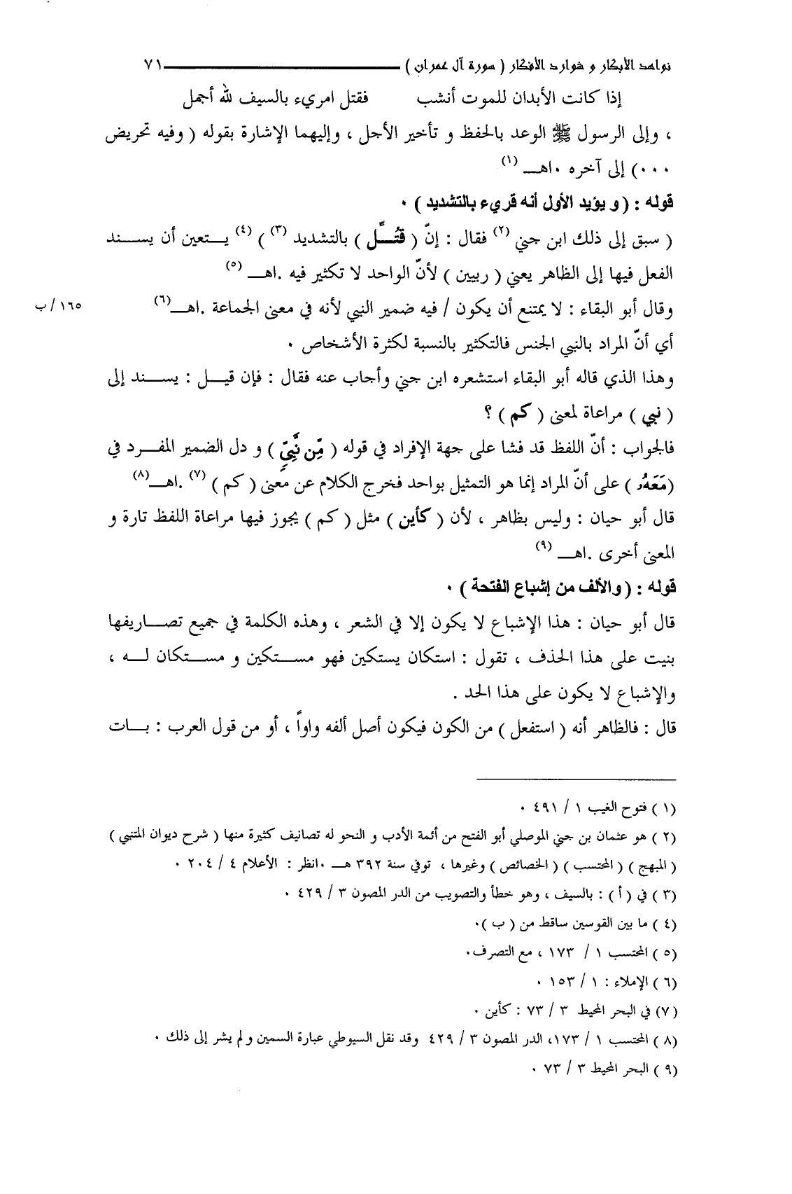 (سبق إلى ذلك ابن جني فقال: إنَّ (قُتِّلَ) بالتشديد) يتعين أن يسند الفعل فيها إلى الظاهر يعني (ربيين) لأنَّ الواحد لا تكثير فيه. اهـ