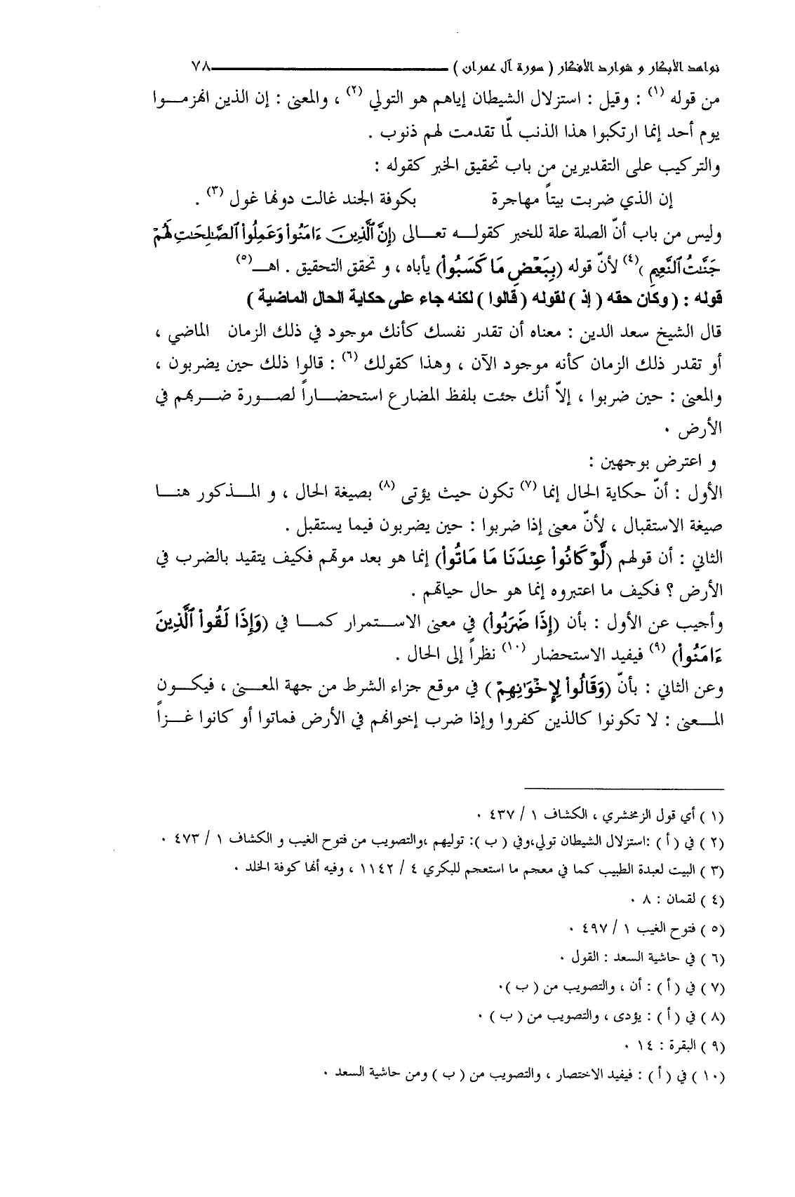 الثاني: أن قولهم (لَوْ كَانُوا عِنْدَنَا مَا مَاتُوا) إنما هو بعد موتهم فكيف يتقيد بالضرب في الأرض؟ فكيف ما اعتبروه إنما هو حال حياتهم.