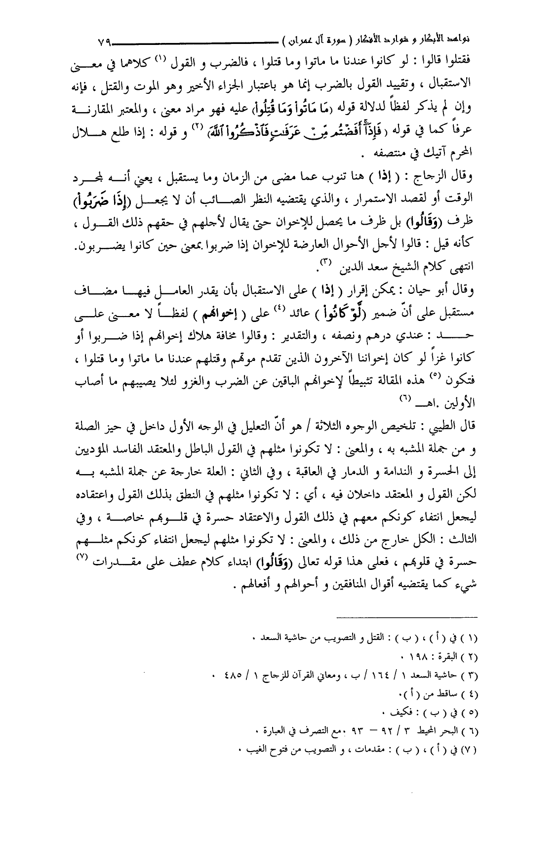 فقتلوا قالوا: لو كانوا عندنا ما ماتوا وما قتلوا، فالضرب والقول كلاهما في معنى الاستقبال، وتقييد القول بالضرب إنما هو باعتبار الجزاء الأخير وهو الموت والقتل، فإنه وإن لم يذكر لفظاً لدلالة قوله (مَا مَاتُوا وَمَا قُتِلُوا) عليه فهو مراد معنى، والمعتبر المقارنة عرفاً كما في قوله (فَإِذَا أَفَضْتُمْ مِنْ عَرَفَاتٍ فَاذْكُرُوا اللهَ) وقوله: إذا طلع هلال المحرم آتيك في منتصفه.