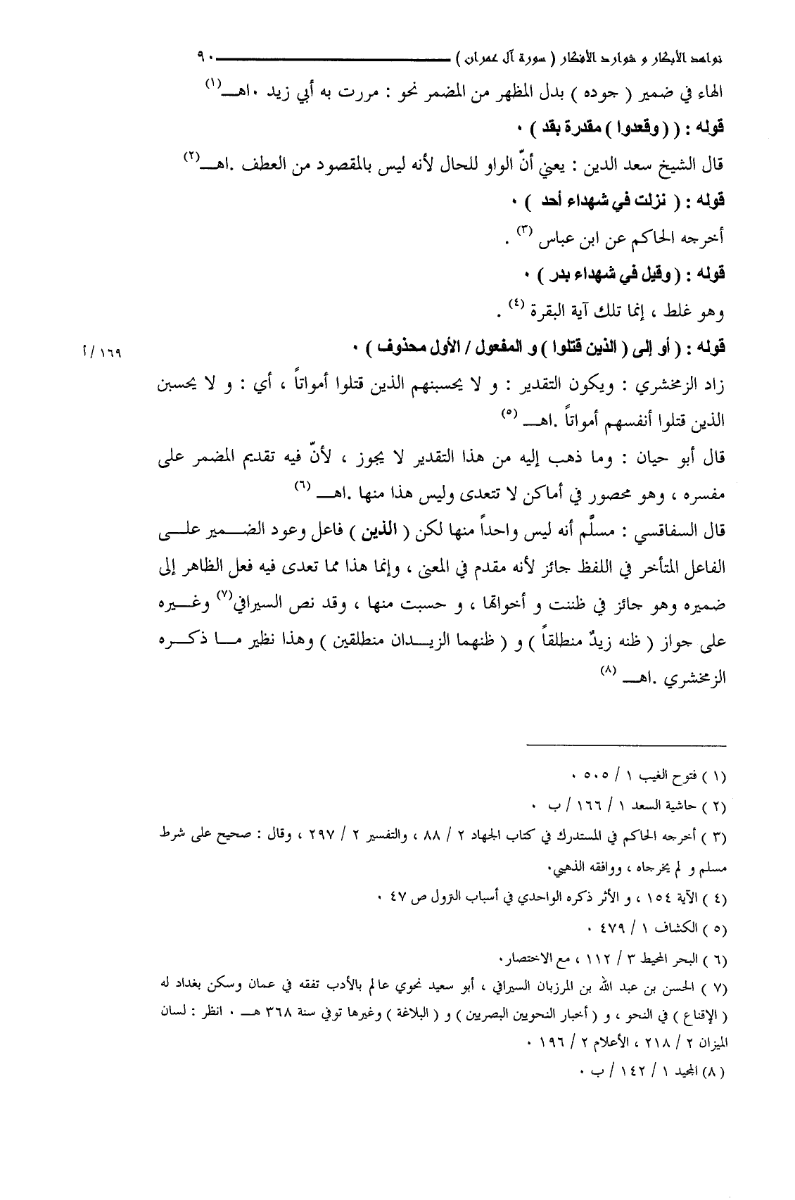 قال السفاقسي: مسلَّم أنه ليس واحداً منها لكن (الذين) فاعل وعود الضمير على الفاعل المتأخر في اللفظ جائز لأنه مقدم في المعنى، وإنما هذا مما تعدى فيه فعل الظاهر إلى ضميره وهو جائز في ظننت وأخواتها، وحسبت منها، وقد نص السيرافي وغيره على جواز (ظنه زيدٌ منطلقاً) و (ظنهما الزيدان منطلقين) وهذا نظير ما ذكره الزمخشري. اهـ