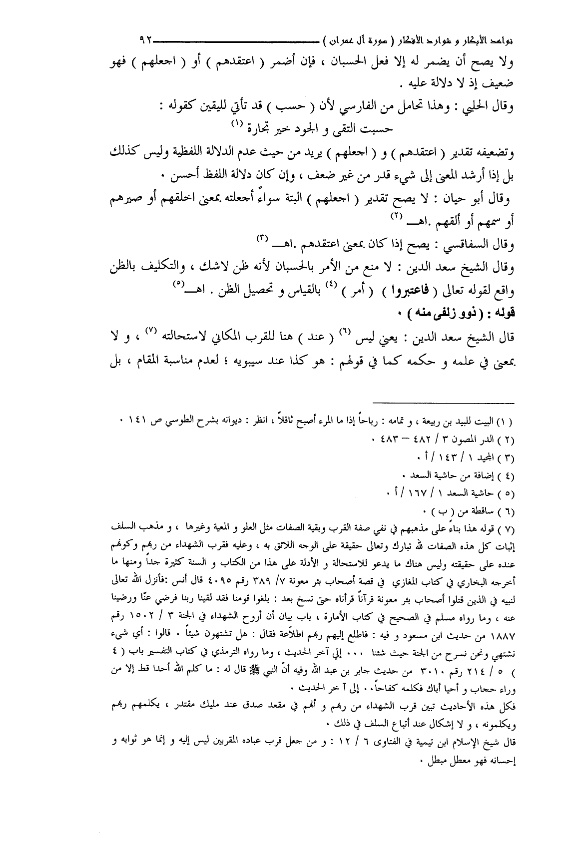 قال الشيخ سعد الدين: يعني ليس (عند) هنا للقرب المكاني لاستحالته، ولا بمعنى في علمه وحكمه كما في قولهم: هو كذا عند سيبويه؛ لعدم مناسبة المقام، بل