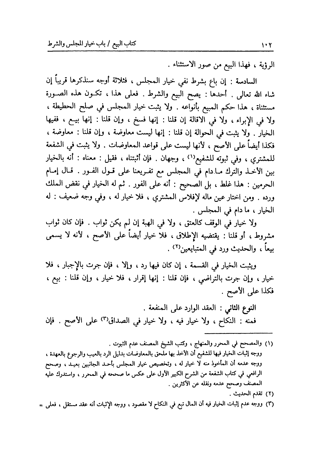 الرؤية، فهذا البيع من صور الاستثناء. السادسة: إن باع بشرط نفي خيار المجلس، فثلاثة أوجه سنذكرها قريبا إن شاء الله تعالى. أحدها: يصح البيع والشرط. فعلى هذا، تكون هذه الصورة مستثناة، هذا حكم المبيع بأنواعه. ولا يثبت خيار المجلس في صلح الحطيطة، ولا في الابراء، ولا في الاقالة إن قلنا: إنها فسخ، وإن قلنا: إنها بيع، ففيها ا لخيار. ولا يثبت في الحوالة إن قلنا: إنها ليست معاوضة، وإن قلنا: معاوضة، فكذا أيضا على الاصح، لانها ليست على قواعد المعاوضات. ولا يثبت في الشفعة للمشتري، وفي ثبوته للشفيع، وجهان. فإن أثبتناه، فقيل: معناه: أنه بالخيار بين الاخذ والترك ما دام في المجلس مع تفريعنا على قول الفور. قال إمام الحرمين: هذا غلط، بل الصحيح: أنه على الفور. ثم له الخيار في نقض الملك ورده. ومن اختار عين ماله لافلاس المشتري، فلا خيار له، وفي وجه ضعيف: له الخيار، ما دام في المجلس. ولا خيار في الوقف كالعتق، ولا في الهبة إن لم يكن ثواب. فإن كان ثواب مشروط، أو قلنا: يقتضيه الاطلاق، فلا خيار أيضا على الاصح، لانه لا يسمى بيعا، والحديث ورد في المتبايعين. ويثبت الخيار في القسمة، إن كان فيها رد، زإلا، فإن جرت بالاجبار، فلا خيار، وإن جرت بالتراضي، فإن قلنا: إنها إقرار، فلا خيار، وإن قلنا: بيع، فكذا على الاصح. النوع الثاني: العقد الوارد على المنفعة. فمنه: النكاح، ولا خيار فيه، ولا خيار في الصداق على الاصح. فإن