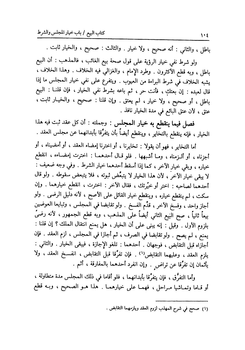 باطل، والثاني: أنه صحيح، ولا خيار. والثالث: صحيح، والخيار ثابت ولو شرط نفي خيار الرؤية على قول صحة بيع الغائب، فالمذهب: أن البيع باطل، وبه قطع الاكثرون. وطرد الامام، والغزالي فيه الخلاف. وهذا الخلاف، يشبه الخلاف في شرط البراءة من العيوب. ويتفرع على نفي خيار المجلس ما إذا قال لعبده: إن بعتك، فأنت حر، ثم باعه بشرط نفي الخيار، فإن قلنا: البيع باطل، أو صحيح، ولا خيار، لم يعتق. وإن قلنا: صحيح، والخيار ثابت، عتق، لان عتق البائع في مدة الخيار نافذ.