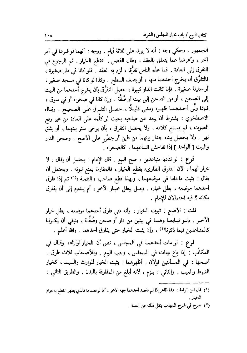 الجمهور. وحكي وجه: أنه لا يزيد على ثلاثة أيام. ووجه: أنهما لو شرعا في أمر آخر، وأعرضا عما يتعلق بالعقد، وطال الفصل، انقطع الخيار. ثم الرجوع في التفرق إلى العادة. فما عده الناس تفرقا، لزم به العقد. فلو كانا في دار صغيرة، فالتفرق أن يخرج أحدهما منها، أو يصعد السطح. وكذا لو كانا في مسجد صغير، أو سفينة صغيرة. فإن كانت الدار كبيرة، حصل التفرق بأن يخرج أحدهما من البيت إلى الصحن، أو من الصحن إلى بيت أو صفة. وإن كانا في صحراء أو في سوق، فإذا ولى أحدهما ظهره ومشى قليلا، حصل التفرق على الصحيح. وقال الاصطخري: يشترط أن يبعد عن صاحبه بحيث لو كلمه على العادة من غير رفع الصوت، لم يسمع كلامه. ولا يحصل التفرق، بأن يرخى ستر بينهما، أو يشق نهر. ولا يحصل ببناء جدار بينهما من طين أو جص على الاصح. وصحن الدار والبيت الواحد إذا تفاحش اتساعهما، كالصحراء. فرع لو تناديا متباعدين، وتبايعا، صح البيع. قال الامام: يحتمل أن يقال: لا خيار لهما، لان التفرق الطارئ يقطع الخيار، فالمقارن يمنع ثبوته. ويحتمل أن يقال: يثبت ما داما في موضعهما، وبهذا قطع صاحب التتمة. ثم إذا فارق أحدهما موضعه، بطل خياره. وهل يبطل خيار الآخر، أم يدوم إلى أن يفارق مكانه ؟ فيه احتمالان للامام. قلت: الاصح: ثبوت الخيار، وأنه متى فارق أحدهما موضعه، بطل خيار الآخر. ولو تبايعا وهما في بيتين من دار أو صحن وصفة، ينبغي أن يكونا كالمتباعدين فيما ذكرنا، وأن يثبت الخيار حتى يفارق أحدهما. والله أعلم. فرع لو مات أحدهما في المجلس، نص أن الخيار لوارثه، وقال في المكاتب: إذا باع ومات في المجلس، وجب البيع. وللاصحاب ثلاث طرق. أصحها: في المسألتين قولان. أظهرهما: يثبت الخيار للوارث والسيد، كخيار الشرط والعيب. والثاني: يلزم، لانه أبلغ من المفارقة بالبدن. والطريق الثاني: