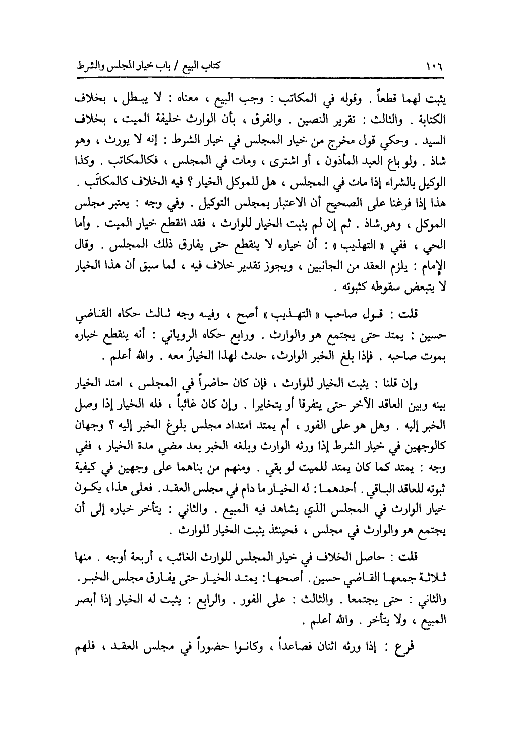 يثبت لهما قطعا. وقوله في المكاتب: وجب البيع، معناه: لا يبطل، بخلاف الكتابة. والثالث: تقرير النصين. والفرق، بأن الوارث خليفة الميت، بخلاف السيد. وحكي قول مخرج من خيار المجلس في خيار الشرط: أنه لا يورث، وهو شاذ. ولو باع العبد المأذون، أو اشترى، ومات في المجلس، فكالمكاتب. وكذا الوكيل بالشراء إذا مات في المجلس، هل للموكل الخيار ؟ فيه الخلاف كالمكاتب. هذا إذا فرغنا على الصحيح أن الاعتبار بمجلس التوكيل. وفي وجه: يعتبر مجلس الموكل، وهو شاذ. ثم إن لم يثبت الخيار للوارث، فقد انقطع خيار الميت. وأما الحي، ففي التهذيب: أن خياره لا ينقطع حتى يفارق ذلك المجلس. وقال الامام: يلزم العقد من الجانبين، ويجوز تقدير خلاف فيه، لما سبق أن هذا الخيار لا يتبعض سقوطه كثبوته. قلت: قول صاحب التهذيب أصح، وفيه وجه ثالث حكاه القاضي حسين: يمتد حتى يجتمع هو والوارث. ورابع حكاه الروياني: أنه ينقطع خياره بموت صاحبه. فإذا بلغ الخبر الوارث، حدث لهذا الخيار معه. والله أعلم. وإن قلنا: يثبت الخيار للوارث، فإن كان حاضرا في المجلس، امتد الخيار بينه وبين العاقد الآخر حتى يتفرقا أو يتخايرا. وإن كان غائبا، فله الخيار إذا وصل الخبر إليه. وهل هو على الفور، أم يمتد امتداد مجلس بلوغ الخبر إليه ؟ وجهان كالوجهين في خيار الشرط إذا ورثه الوارث وبلغه الخبر بعد مضي مدة الخيار، ففي وجه: يمتد كما كان يمتد للميت لو بقي. ومنهم من بناهما على وجهين في كيفية ثبوته للعاقد الباقي. أحدهما: له الخيار ما دام في مجلس العقد. فعلى هذا، يكون خيار الوارث في المجلس الذي يشاهد فيه المبيع. والثاني: يتأخر خياره إلى أن يجتمع هو والوارث في مجلس، فحينئذ يثبت الخيار للوارث. قلت: حاصل الخلاف في خيار المجلس للوارث الغائب، أربعة أوجه. منها ثلاثة جمعها القاضي حسين. أصحها: يمتد الخيار حتى يفارق مجلس الخبر. والثاني: حتى يجتمعا. والثالث: على الفور. والرابع: يثبت له الخيار إذا أبصر المبيع، ولا يتأخر. والله أعلم. فرع إذا ورثه اثنان فصاعدا، وكانوا حضورا في مجلس العقد، فلهم