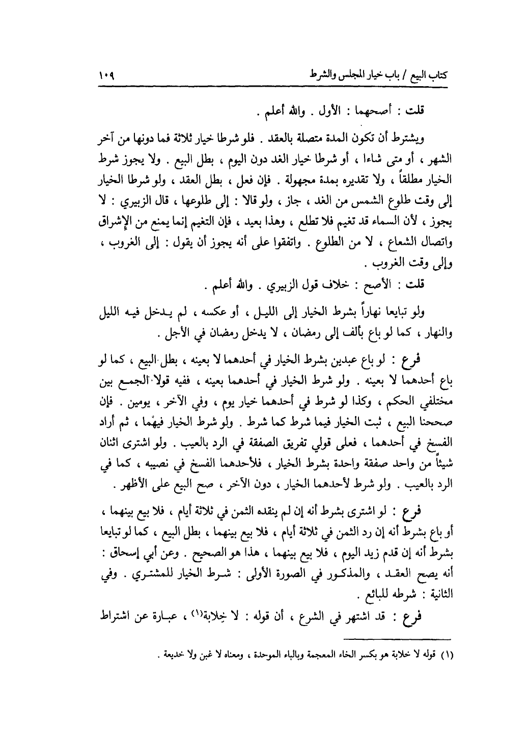 قلت: أصحهما: الاول. والله أعلم ويشترط أن تكون المدة متصلة بالعقد. فلو شرطا خيار ثلاثة فما دونها من آخر الشهر، أو متى شاءا، أو شرطا خيار الغد دون اليوم، بطل البيع. ولا يجوز شرط الخيار مطلقا، ولا تقديره بمدة مجهولة. فإن فعل، بطل العقد، ولو شرطا الخيار إلى وقت طلوع الشمس من الغد، جاز. ولو قالا: إلى طلوعها، قال الزبيري: لا يجوز، لان السماء قد تغيم فلا تطلع، وهذا بعيد، فإن التغيم إنما يمنع من الاشراق واتصال الشعاع، لا من الطلوع. واتفقوا على أنه يجوز أن يقول: إلى الغروب، وإلى وقت الغروب. قلت: الاصح: خلاف قول الزبيري. والله أعلم. ولو تبايعا نهارا بشرط الخيار إلى الليل، أو عكسه، لم يدخل فيه الليل والنهار، كما لو باع بألف إلى رمضان، لا يدخل رمضان في الاجل. فرع لو باع عبدين بشرط الخيار في أحدهما لا بعينه، بطل البيع، كما لو باع أحدهما لا بعينه. ولو شرط الخيار في أحدهما بعينه، ففيه قولا الجمع بين مختلفي الحكم، وكذا لو شرط في أحدهما خيار يوم، وفي الآخر، يومين. فإن صححنا البيع، ثبت الخيار فيما شرط كما شرط. ولو شرط الخيار فيهما، ثم أراد ا لفسخ في أحدهما، فعلى قولي تفريق الصفقة في الرد بالعيب. ولو اشترى اثنان شيئا من واحد صفقة واحدة بشرط الخيار، فلاحدهما الفسخ في نصيبه، كما في الرد بالعيب. ولو شرط لاحدهما الخيار، دون الآخر، صح البيع على الاظهر. فرع لو اشترى بشرط أنه إن لم ينقده الثمن في ثلاثة أيام، فلابيع بينهما، أو باع بشرط أنه إن رد الثمن في ثلاثة أيام، فلا بيع بينهما، بطل البيع، كما لو تبايعا بشرط أنه إن قدم زيد اليوم، فلا بيع بينهما، هذا هو الصحيح. وعن أبي إسحق: أنه يصح العقد، والمذكور في الصورة الاولى: شرط الخيار للمشتري. وفي الثانية: شرط للبائع. فرع قد اشتهر في الشرع، أن قوله: لا خلابة، عبارة عن اشتراط