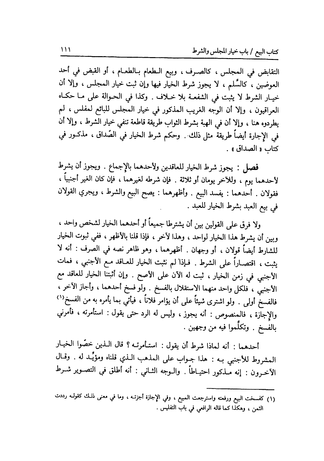 فصل يجوز شرط الخيار للعاقدين ولاحدهما بالاجماع. ويجوز أن يشرط لاحدهما يوم، وللآخر يومان أو ثلاثة. فإن شرطه لغيرهما، فإن كان الغير أجنبيا، فقولان. أحدهما: يفسد البيع. وأظهرهما: يصح البيع والشرط، ويجري القولان في بيع العبد بشرط الخيار للعبد. ولا فرق على القولين بين أن يشرطا جميعا أو أحدهما الخيار لشخص واحد، وبين أن يشرط هذا الخيار لواحد، وهذا لآخر. فإذا قلنا بالاظهر، ففي ثبوت الخيار للشارط أيضا قولان، أو وجهان. أظهرهما، وهو ظاهر نصه في الصرف: أنه لا يثبت، اقتصارا على الشرط. فإذا لم نثبت الخيار للعاقد مع الاجنبي، فمات الاجنبي في زمن الخيار، ثبت له الآن على الاصح. وإن أثبتنا الخيار للعاقد مع الاجنبي، فلكل واحد منهما الاستقلال بالفسخ. ولو فسخ أحدهما، وأجاز الآخر، فالفسخ أولى. ولو اشترى شيئا على أن يؤامر فلانا، فيأتي بما يأمره به من الفسخ والاجازة، فالمنصوص: أنه يجوز، وليس له الرد حتى يقول: استأمرته، فأمرني بالفسخ. وتكلموا فيه من وجهين، أحدهما: أنه لماذا شرط أن يقول: استأمرته ؟ قال الذين خصوا الخيار المشروط للاجنبي به: هذا جواب على المذهب الذي قلناه ومؤيد له. وقال الآخرون: إنه مذكور احتياطا. والوجه الثاني: أنه أطلق في التصوير شرط