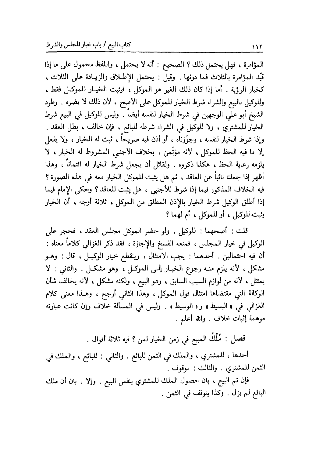 المؤامرة، فهل يحتمل ذلك ؟ الصحيح: أنه لا يحتمل، واللفظ محمول على ما إذا قيد المؤامرة بالثلاث فما دونها. وقيل: يحتمل الاطلاق والزيادة على الثلاث، كخيار الرؤية. أما إذا كان ذلك الغير هو الموكل، فيثبت الخيار للموكل فقط، وللوكيل بالبيع والشراء شرط الخيار للموكل على الاصح، لان ذلك لا يضره. وطرد الشيخ أبو علي الوجهين في شرط الخيار لنفسه أيضا. وليس للوكيل في البيع شرط الخيار للمشتري، ولا للوكيل في الشراء شرطه للبائع، فإن خالف، بطل العقد. وإذا شرط الخيار لنفسه، وجوزناه، أو أذن فيه صريحا، ثبت له الخيار، ولا يفعل إلا ما فيه الحظ للموكل، لانه مؤتمن، بخلاف الاجنبي المشروط له الخيار، لا يلزمه رعاية الحظ، هكذا ذكروه. ولقائل أن يجعل شرط الخيار له ائتمانا، وهذا أظهر إذا جعلناه نائبا عن العاقد. ثم هل يثبت للموكل الخيار معه في هذه الصورة ؟ فيه الخلاف المذكور فيما إذا شرط للاجنبي، هل يثبت للعاقد ؟ وحكى الامام فيما إذا أطلق الوكيل شرط الخيار بالاذن المطلق من الموكل، ثلاثة أوجه، أن الخيار يثبت للوكيل، أو للموكل، أم لهما ؟ قلت: أصحهما: للوكيل. ولو حضر الموكل مجلس العقد، فحجر على الوكيل في خيار المجلس، فمنعه الفسخ والاجازة، فقد ذكر الغزالي كلاما معناه: أن فيه احتمالين. أحدهما: يجب الامتثال، وينقطع خيار الوكيل، قال: وهو مشكل، لانه يلزم منه رجوع الخيار إلى الموكل، وهو مشكل. والثاني: لا يمتثل، لانه من لوازم السبب السابق، وهو البيع، ولكنه مشكل، لانه يخالف شأن الوكالة التي مقتضاها امتثال قول الموكل، وهذا الثاني أرجح، وهذا معنى كلام الغزالي في البسيط والوسيط. وليس في المسألة خلاف وإن كانت عبارته موهمة إثبات خلاف. والله أعلم. فصل ملك المبيع في زمن الخيار لمن ؟ فيه ثلاثة أقوال: أحدها، للمشتري، والملك في الثمن للبائع. والثاني: للبائع، والملك في الثمن للمشتري. والثالث: موقوف. فإن تم البيع، بان حصول الملك للمشتري بنفس البيع، وإلا، بان أن ملك البائع لم يزل. وكذا يتوقف في الثمن.