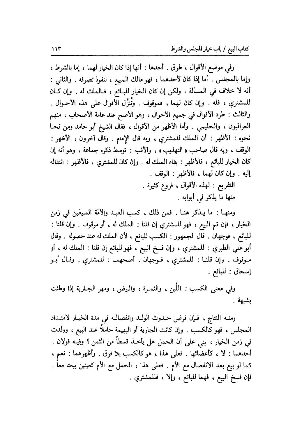 وفي موضع الاقوال، طرق. أحدها: أنها إذا كان الخيار لهما، إما بالشرط، وإما بالمجلس. أما إذا كان لاحدهما، فهو مالك المبيع، لنفوذ تصرفه. والثاني: أنه لا خلاف في المسألة، ولكن إن كان الخيار للبائع، فالملك له. وإن كان للمشتري، فله. وإن كان لهما، فموقوف. وتنزل الاقوال على هذه الاحوال. والثالث: طرد الاقوال في جميع الاحوال، وهو الاصح عند عامة الاصحاب، منهم العراقيون، والحليمي. وأما الاظهر من الاقوال، فقال الشيخ أبو حامد ومن نحا نحوه: الاظهر: أن الملك للمشتري، وبه قال الامام. وقال آخرون، الاظهر: الوقف، وبه قال صاحب التهذيب، والاشبه: توسط ذكره جماعة، وهو أنه إن كان الخيار للبائع، فالاظهر: بقاء الملك له. وإن كان للمشتري، فالاظهر: انتقاله إليه. وإن كان لهما، فالاظهر: الوقف. التفريع. لهذه الاقوال، فروع كثيرة. منها: ما يذكر في أبوابه. ومنها: ما يذكر هنا. فمن ذلك، كسب العبد والامة المبيعين في زمن الخيار، فإن تم البيع، فهو للمشتري إن قلنا: الملك له، أو موقوف. وإن قلنا: للبائع، فوجهان. قال الجمهور: الكسب للبائع، لان الملك له عند حصوله. وقال أبو علي الطبري: للمشتري. وإن فسخ البيع، فهو للبائع إن قلنا: الملك له، أو موقوف. وإن قلنا: للمشتري، فوجهان. أصحهما: للمشتري. وقال أبو إسحق: للبائع. وفي معنى الكسب: اللبن، والثمرة، والبيض، ومهر الجارية إذا وطئت بشبهة. ومنه النتاج، فإن فرض حدوث الولد وانفصاله في مدة الخيار لامتداد المجلس، فهو كالكسب. وإن كانت الجارية أو البهيمة حاملا عند البيع، وولدت في زمن الخيار، بني على أن الحمل هل يأخذ قسطا من الثمن ؟ وفيه قولان. أحدهما: لا، كأعضائها. فعلى هذا، هو كالكسب بلا فرق. وأظهرهما: نعم، كما لو بيع بعد الانفصال مع الام. فعلى هذا، الحمل مع الام كعينين بيعتا معا. فإن فسخ البيع، فهما للبائع، وإلا، فللمشتري.
