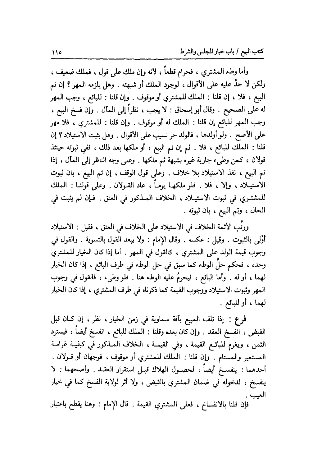وأما وطئ المشتري، فحرام قطعا، لانه وإن ملك على قول، فملك ضعيف، ولكن لا حد عليه على الاقوال، لوجود الملك أو شبهته. وهل يلزمه المهر ؟ إن تم ا لبيع، فلا، إن قلنا: الملك للمشتري أو موقوف. وإن قلنا: للبائع، وجب المهر له على الصحيح. وقال أبو إسحق: لا يجب، نظرا إلى المآل. وإن فسخ البيع، وجب المهر للبائع إن قلنا: الملك له أو موقوف. وإن قلنا: للمشتري، فلا مهر على الاصح. ولو أولدها، فالولد حر نسيب على الاقوال. وهل يثبت الاستيلاد ؟ إن قلنا: الملك للبائع، فلا. ثم إن تم البيع، أو ملكها بعد ذلك، ففي ثبوته حينئذ قولان، كمن وطئ جارية غيره بشبهة ثم ملكها. وعلى وجه الناظر إلى المآل، إذا تم البيع، نفذ الاستيلاد بلا خلاف. وعلى قول الوقف، إن تم البيع، بان ثبوت الاستيلاد، وإلا، فلا. فلو ملكها يوما، عاد القولان. وعلى قولنا: الملك للمشتري في ثبوت الاستيلاد، الخلاف المذكور في العتق. فإن لم يثبت في الحال، وتم البيع، بان ثبوته. ورتب الائمة الخلاف في الاستيلاد على الخلاف في العتق، فقيل: الاستيلاد أولى بالثبوت. وقيل: عكسه. وقال الامام: ولا يبعد القول بالتسوية. والقول في وجوب قيمة الولد على المشتري، كالقول في المهر. أما إذا كان الخيار للمشتري وحده، فحكم حل الوطئ كما سبق في حل الوطئ في طرف البائع إذا كان الخيار لهما، أو له. وأما البائع، فيحرم عليه الوطئ هنا. فلو وطئ، فالقول في وجوب المهر وثبوت الاستيلاد ووجوب القيمة كما ذكرناه في طرف المشتري، إذا كان الخيار لهما، أو للبائع. فرع إذا تلف المبيع بآفة سماوية في زمن الخيار، نظر، إن كان قبل القبض، انفسخ العقد. وإن كان بعده وقلنا: الملك للبائع، انفسخ أيضا، فيسترد الثمن، ويغرم للبائع القيمة. وفي القيمة، الخلاف المذكور في كيفية غرامة المستعير والمستام. وإن قلنا: الملك للمشتري أو موقوف، فوجهان أو قولان. أحدهما: ينفسخ أيضا، لحصول الهلاك قبل استقرار العقد. وأصحهما: لا ينفسخ، لدخوله في ضمان المشتري بالقبض، ولا أثر لولاية الفسخ كما في خيار العيب. فإن قلنا بالانفساخ، فعلى المشتري القيمة. قال الامام: وهنا يقطع باعتبار