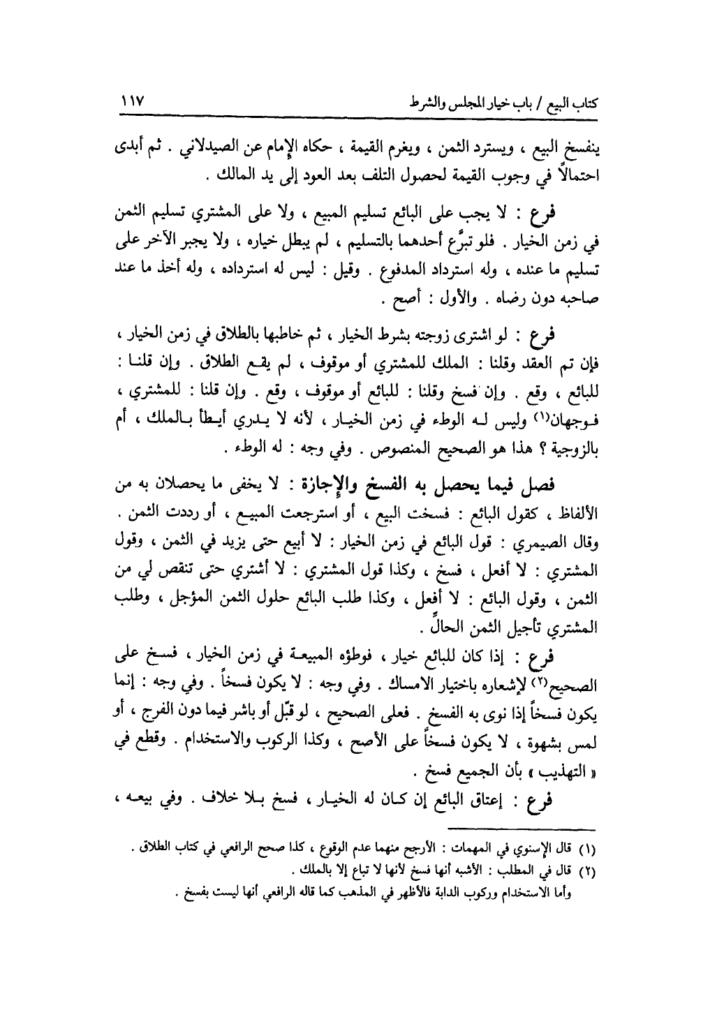 ينفسخ البيع، ويسترد الثمن، ويغرم القيمة، حكاه الامام عن الصيدلاني. ثم أبدى احتمالا في وجوب القيمة لحصول التلف بعد العود إلى يد المالك. فرع لا يجب على البائع تسليم المبيع، ولا على المشتري تسليم الثمن في زمن الخيار. فلو تبرع أحدهما بالتسليم، لم يبطل خياره، ولا يجبر الآخر على تسليم ما عنده، وله استرداد المدفوع. وقيل: ليس له استرداده، وله أخذ ما عند صاحبه دون رضاه. والاول: أصح. فرع لو اشترى زوجته بشرط الخيار، ثم خاطبها بالطلاق في زمن الخيار، فإن تم العقد وقلنا: الملك للمشتري أو موقوف، لم يقع الطلاق. وإن قلنا: للبائع، وقع. وإن فسخ وقلنا: للبائع أو موقوف، وقع. وإن قلنا: للمشتري، فوجهان. وليس له الوطئ في زمن الخيار، لانه لا يدري أيطأ بالملك، أو بالزوجية ؟ هذا هو الصحيح المنصوص. وفي وجه: له الوطئ.