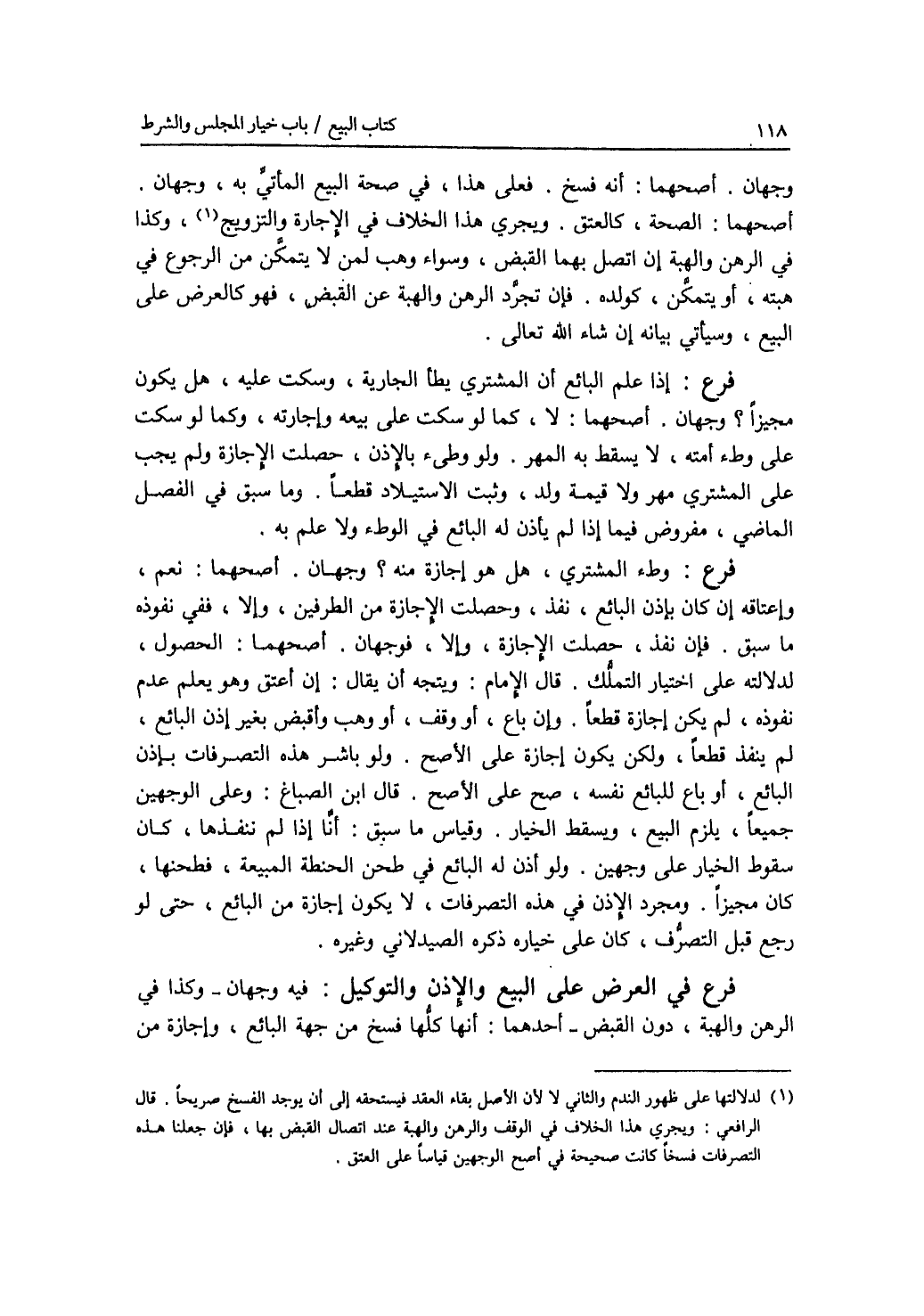 وجهان. أصحهما: أنه فسخ. فعلى هذا، في صحة البيع المأتي به، وجهان. أصحهما: الصحة، كالعتق. ويجري هذا الخلاف في الاجارة والتزويج، وكذا في الرهن والهبة إن اتصل بهما القبض، وسواء وهب لمن لا يتمكن من الرجوع في هبته، أو يتمكن، كولده. فإن تجرد الرهن والهبة عن القبض، فهو كالعرض على البيع، وسيأتي بيانه إن شاء الله تعالى. فرع إذا علم البائع أن المشتري يطأ الجارية، وسكت عليه، هل يكون مجيزا ؟ وجهان. أصحهما: لا، كما لو سكت على بيعه وإجارته، وكما لو سكت على وطئ أمته، لا يسقط به المهر. ولو وطئ بالاذن، حصلت الاجازة، ولم يجب على المشتري مهر ولا قيمة ولد، وثبت الاستيلاد قطعا. وما سبق في الفصل الماضي، مفروض فيما إذا لم يأذن له البائع في الوطئ ولا علم به. فرع وطئ المشتري، هل هو إجازة منه ؟ وجهان. أصحهما: نعم، وإعتاقه إن كان بإذن البائع، نفذ، وحصلت الاجازة في الطرفين، وإلا، ففي نفوذه ما سبق. فإن نفذ، حصلت الاجازة، وإلا، فوجهان. أصحهما: الحصول، لدلالته على اختيار التملك. قال الامام: ويتجه أن يقال: إن أعتق وهو يعلم عدم نفوذه، لم يكن إجازة قطعا. وإن باع، أو وقف، أو وهب وأقبض بغير إذن البائع لم ينفذ قطعا، ولكن يكون إجازة على الاصح. ولو باشر هذه التصرفات بإذن البائع، أو باع للبائع نفسه، صح على الاصح. قال ابن الصباغ: وعلى الوجهين جميعا، يلزم البيع، ويسقط الخيار. وقياس ما سبق: أنا إذا لم ننفذها، كان سقوط الخيار على وجهين. ولو أذن له البائع في طحن الحنطة المبيعة، فطحنها، كان مجيزا. ومجرد الاذن في هذه التصرفات، لا يكون إجازة من البائع، حتى لو رجع قبل التصرف، كان على خياره، ذكره الصيدلاني وغيره. فرع في العرض على البيع والاذن والتوكيل فيه وجهان - وكذا في الرهن والهبة، دون القبض -. أحدهما: أنها كلها فسخ من جهة البائع، وإجازة من