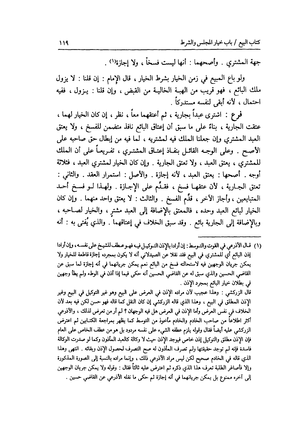 جهة المشتري. وأصحهما: أنها ليست فسخا، ولا إجازة. ولو باع المبيع في زمن الخيار بشرط الخيار، قال الامام: إن قلنا: لا يزول ملك البائع، فهو قريب من الهبة الخالية من القبض، وإن قلنا: يزول، ففيه احتمال، لانه أبقى لنفسه مستدركا. فرع اشترى عبدا بجارية، ثم أعتقهما معا، نظر، إن كان الخيار لهما، عتقت الجارية، بناء على ما سبق أن إعتاق البائع نافذ متضمن للفسخ، ولا يعتق العبد المشتري وإن جعلنا الملك فيه لمشتريه، لما فيه من إبطال حق صاحبه على الاصح. وعلى الوجه القائل بنفاذ إعتا المشتري، تفريعا على أن الملك للمشتري، يعتق العبد، ولا تعتق الجارية. وإن كان الخيار لمشتري العبد، فثلاثة أوجه. أصحها: يعتق العبد، لانه إجازة. والاصل: استمرار العقد. والثاني: تعتق الجارية، لان عتقها فسخ، فقدم على الاجازة. ولهذا لو فسخ أحد المتبايعين، وأجاز الآخر، قدم الفسخ. والثالث: لا يعتق واحد منهما. وإن كان الخيار لبائع العبد وحده، فالمعتق بالاضافة إلى العبد مشتر، والخيار لصاحبه، وبالاضافة إلى الجارية بائع. وقد سبق الخلاف في إعتاقهما والذي يفتى به: أنه