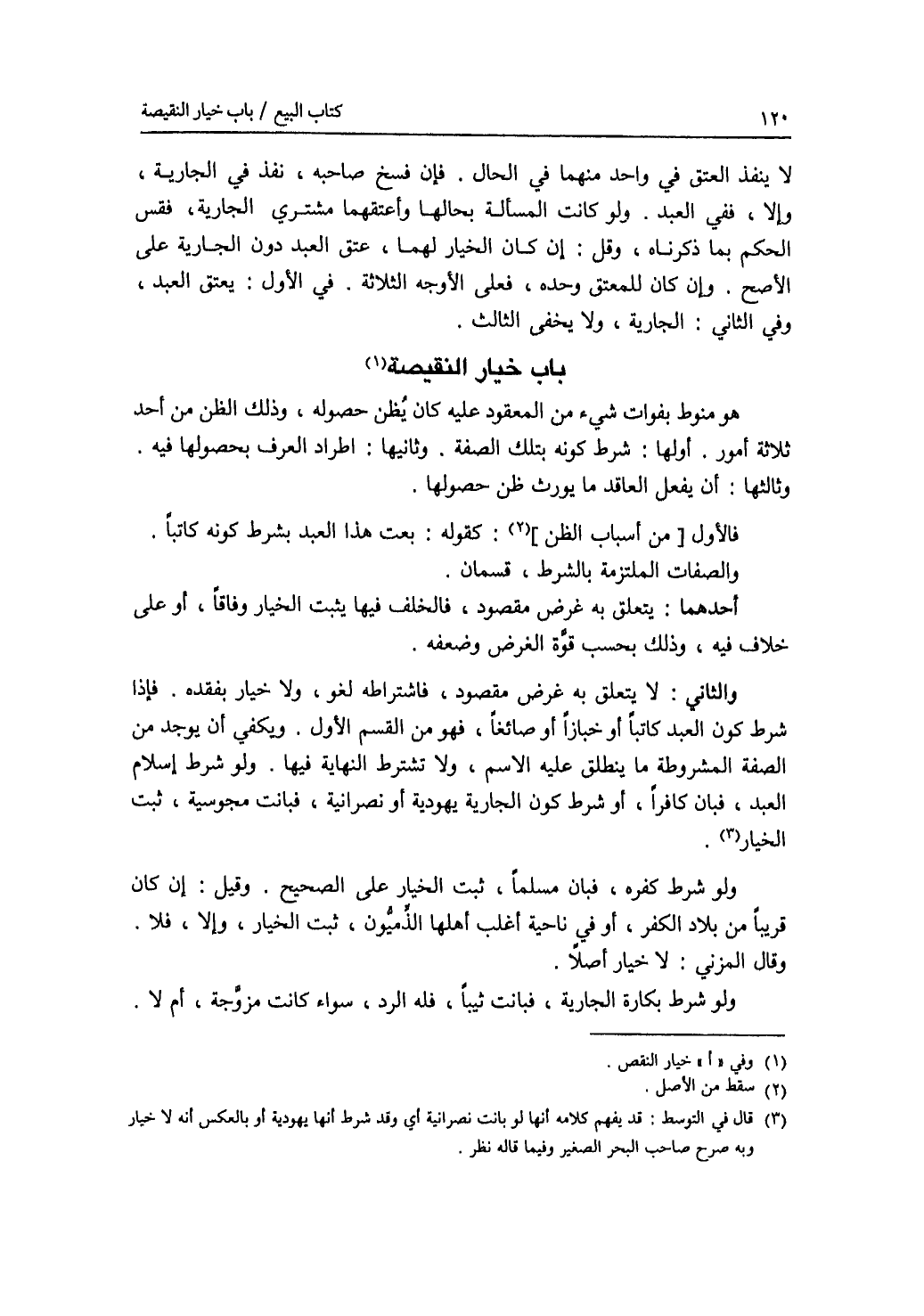 هو منوط بفوات شئ من المعقود عليه كان يظن حصوله، وذلك الظن من أحد ثلاثة أمور. أولها: شرط كونه بتلك الصفة. وثانيها: اطراد العرف بحصولها فيه. وثالثها: أيفعل العاقد ما يورث ظن حصولها. فالاول: من أسباب الظن: كقوله: بعت هذا العبد بشرط كونه كاتبا. والصفات الملتزمة بالشرط، قسمان. أحدهما: يتعلق به غرض مقصود، فالخلف فيها يثبت الخيار وفاقا، أو على خلاف فيه، وذلك بحسب قوة الغرض وضعفه. والثاني: لا يتعلق به غرض مقصود، فاشتراطه لغو، ولا خيار بفقده. فإذا شرط كون العبد كاتبا أو خبازا أو صائغا، فهو من القسم الاول. ويكفي أن يوجد من الصفة المشروطة ما ينطلق عليه الاسم، ولا تشترط النهاية فيها. ولو شرط إسلام العبد، فبان كافرا، أو شرط كون الجارية يهودية أو نصرانية، فبانت مجوسية، ثبت الخيار. ولو شرط كفره، فبان مسلما، ثبت الخيار على الصحيح. وقيل: إن كان قريبا من بلاد الكفر، أو في ناحية أغلب أهلها الذميون، ثبت الخيار، وإلا، فلا. وقال المزني: لا خيار أصلا. ولو شرط بكارة الجارية، فبانت ثيبا، فله الرد، سواء كانت مزوجة، أم لا.