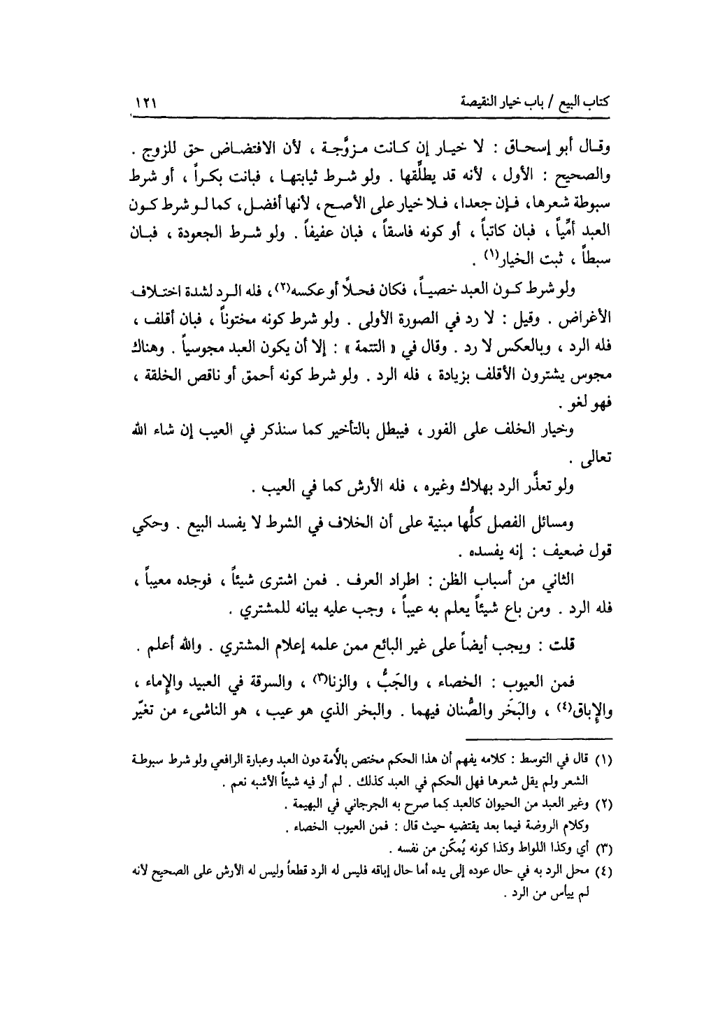 وقال أبو إسحق: لا خيار إن كانت مزوجة، لان الافتضاض حق للزوج. والصحيح: الاول، لانه قد يطلقها. ولو شرط ثيابتها، فبانت بكرا، أو شرط سبوطة شعرها، فبان جعدا، فلا خيار على الاصح، لانها أفضل، كما لو شرط كون العبد أميا، فبان كاتبا، أو كونه فاسقا، فبان عفيفا. ولو شرط الجعودة، فبان سبطا، ثبت الخيار. ولو شرط كون العبد خصيا، فبان فحلا أو عكسه، فله الرد، لشدة اختلاف الاغراض. وقيل: لا رد في الصورة الاولى. ولو شرط كونه مختونا، فبان أقلف، فله الرد، وبالعكس لا رد. وقال في التتمة: إلا أن يكون العبد مجوسيا. وهناك مجوس يشترون الاقلف بزيادة، فله الرد. ولو شرط كونه أحمق أو ناقص الخلقة، فهو لغو. وخيار الخلف على الفور، فيبطل بالتأخير كما سنذكر في العيب إن شاء الله تعالى. ولو تعذر الرد بهلاك وغيره، فله الارش كما في العيب. ومسائل الفصل كلها مبنية على أن الخلاف في الشرط لا يفسد البيع. وحكي قول ضعيف: أنه يفسده. الثاني من أسباب الظن: اطراد العرف. فمن اشترى شيئا، فوجده معيبا، فله الرد. ومن باع شيئا يعلم به عيبا، وجب عليه بيانه للمشتري. قلت: ويجب أيضا على غير البائع ممن علمه إعلام المشتري. والله أعلم. فمن العيوب: الخصاء، والجب، والزنا، والسرقة في العبيد والاماء، والاباق، والبخر والصنان فيهما. والبخر الذي هو عيب، هو الناشئ من تغير