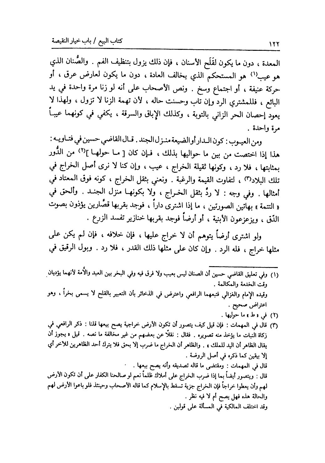 المعدة، دون ما يكون لقلح الاسنان، فإن ذلك يزول بتنظيف الفم. والصنان الذي هو عيب، هو المستحكم الذي يخالف العادة، دون ما يكون لعارض عرق، أو حركة عنيفة، أو اجتماع وسخ. ونص الاصحاب على أنه لو زنا مرة واحدة في يد البائع، فللمشتري الرد وإن تاب وحسنت حاله، لان تهمة الزنا لا تزول، ولهذا لا يعود إحصان الحر الزاني بالتوبة، وكذلك الاباق والسرقة، يكفي في كونهما عيبا مرة واحدة. ومن العيوب: كون الدار أو الضيعة منزل الجند. قال القاضي حسين في فتاويه: هذا إذا اختصت من بين ما حواليها بذلك، فإن كان ما حواليها من الدور بمثابتها، فلا رد، وكونها ثقيلة الخراج، عيب، وإن كنا لا نرى أصل الخراج في تلك البلاد، لتفاوت القيمة والرغبة. ونعني بثقل الخراج، كونه فوق المعتاد في أمثالها. وفي وجه: لا رد بثقل الخراج، ولا بكونها منزل الجند. وألحق في التتمة بهاتين الصورتين، ما إذا اشترى دارا، فوجد بقربها قصارين يؤذون بصوت الدق، ويزعزعون الابنية، أو أرضا فوجد بقربها خنازير تفسد الزرع. ولو اشترى أرضا يتوهم أن لا خراج عليها، فبان خلافه، فإن لم يكن على مثلها خراج، فله الرد. وإن كان على مثلها ذلك القدر، فلا رد. وبول الرقيق في