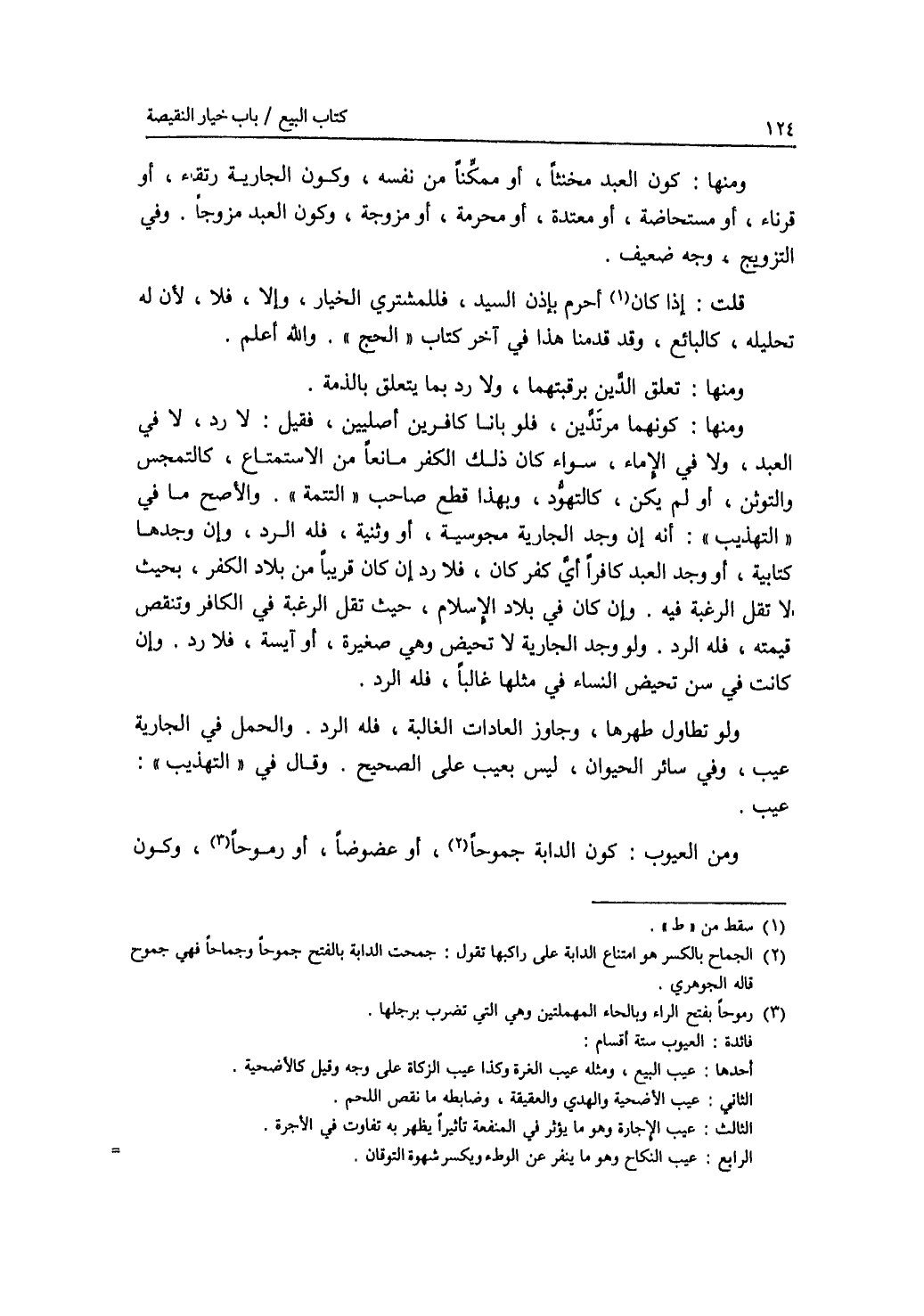 ومنها: كون العبد مخنثا، أو ممكنا من نفسه، وكون الجارية رتقاء، أو قرناء، أو مستحاضة، أو معتدة، أو محرمة، أو مزوجة، وكون العبد مزوجا. وفي التزويج، وجه ضعيف. قلت: إذا أحرم بإذن السيد، فللمشتري الخيار، وإلا، فلا، لان له تحليله، كالبائع، وقد قدمنا هذا في آخر كتاب الحج. والله أعلم. ومنها: تعلق الدين برقبتهما، ولا رد بما يتعلق بالذمة. ومنها: كونهما مرتدين، فلو بانا كافرين أصليين، فقيل: لا رد، لا في العبد، ولا في الاماء، سواء كان ذلك الكفر مانعا من الاستمتاع، كالتمجس والتوثن، أو لم يكن، كالتهود، وبهذا قطع صاحب التتمة. والاصح ما في التهذيب: أنه إن وجد الجارية مجوسية، أو وثنية، فله الرد، وإن وجدها كتابية، أو وجد العبد كافرا أي كفر كان، فلا رد إن كان قريبا من بلاد الكفر، بحيث لا تقل الرغبة فيه. وإن كان في بلاد الاسلام، حيث تقل الرغبة في الكافر وتنقص قيمته، فله الرد. ولو وجد الجارية لا تحيض وهي صغير، أو آيسة، فلا رد. وإن كانت في سن تحيض النساء في مثلها غالبا، فله الرد. ولو تطاول طهرها، وجاوز العادات الغالبة، فله الرد. والحمل في الجارية عيب وفي سائر الحيوان، ليس بعيب على الصحيح. وقال في التهذيب: عيب. ومن العيوب: كون الدابة جموحا، أو عضوضا، أو رموحا، وكون