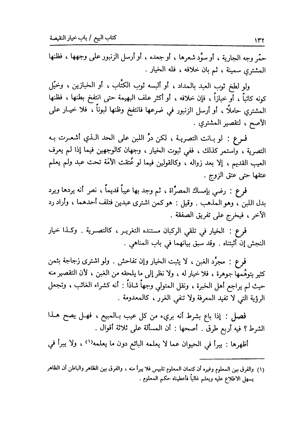 حمر وجه الجارية، أو سود شعرها، أو جعده، أو أرسل الزنبور على وجهها، فظنها المشتري سمينة، ثم بان خلافه، فله الخيار. ولو لطخ ثوب العبد بالمداد، أو ألبسه ثوب الكتاب، أو الخبازين، وخيل كونه كاتبا، أو خبازا، فبان خلافه، أو أكثر علف البهيمة حتى انتفخ بطنها، فظنها المشتري حاملا، أو أرسل الزنبور في ضرعها فانتفخ وظنها لبونا، فلا خيار على ا لاصح، لتقصير المشتري. فرع لو بانت التصرية، لكن در اللبن على الحد الذي أشعرت به التصرية، واستمر كذلك، ففي ثبوت الخيار، وجهان كالوجهين فيما إذا لم يعرف العيب القديم، إلا بعد زواله، وكالقولين فيما لو عتقت الامة تحت عبد ولم يعلم عتقها حتى عتق الزوج. فرع رضي بإمساك المصراة، ثم وجد بها عيبا قديما، نص أنه يردها ويرد بدل اللبن، وهو المذهب. وقيل: هو كمن اشترى عبدين فتلف أحدهما، وأراد رد الآخر، فيخرج على تفريق الصفقة. فرع الخيار في تلقي الركبان مستنده التعزير، كالتصرية. وكذا خيار النجش إن أثبتناه. وقد سبق بيانهما في باب المناهي. فرع مجرد الغبن، لا يثبت الخيار وإن تفاحش. ولو اشترى زجاجة بثمن كثير يتوهمها جوهرة، فلا خيار له، ولا نظر إلى ما يلحقه من الغبن، لان التقصير منه حيث لم يراجع أهل الخبرة، ونقل المتولي وجها شاذا: أنه كشراء الغائب، وتجعل ا لرؤية التي لا تفيد المعرفة ولا تنفي الغرر، كالمعدومة.