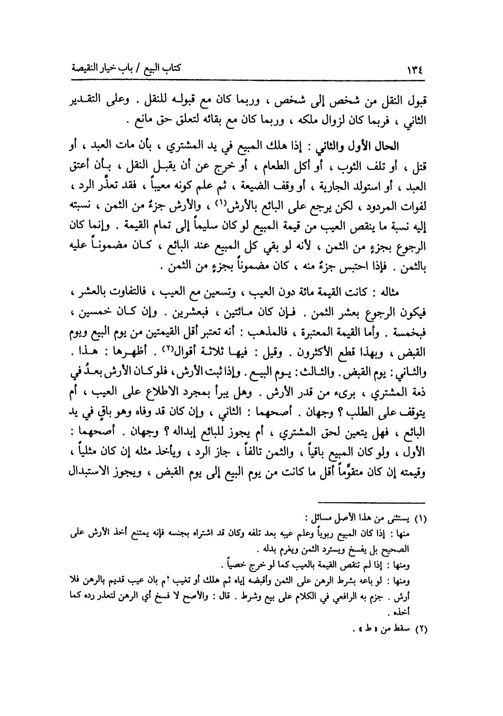 قبول النقل من شخص إلى شخص، وربما كان مع قبوله للنقل. وعلى التقدير الثاني، فربما كان لزوال ملكه، وربما كان مع بقائه لتعلق حق مانع. الحال الاول والثاني: إذا هلك المبيع في يد المشتري، بأن مات العبد، أو قتل، أو تلف الثوب، أو أكل الطعام، أو خرج عن أن يقبل النقل، بأن أعتق العبد، أو استولد الجارية، أو وقف الضيعة، ثم علم كونه معيبا، فقد تعذر الرد، لفوات المردود، لكن يرجع على البائع بالارش، والارش جزء من الثمن، نسبته إليه نسبة ما ينقص العيب من قيمة المبيع لو كان سليما إلى تمام القيمة. وإنما كان الرجوع بجزء من الثمن، لانه لو بقي كل المبيع عند البائع، كان مضمونا عليه بالثمن. فإذا احتبس جزء منه، كان مضمونا بجزء من الثمن. مثاله: كانت القيمة مائة دون العيب، وتسعين مع العيب، فالتفاوت بالعشر، فيكون الرجوع بعشر الثمن. فإن كان مائتين، فبعشرين. وإن كان خمسين، فبخمسة. وأما القيمة المعتبرة، فالمذهب: أنه تعتبر أقل القيمتين من يوم البيع ويوم القبض، وبهذا قطع الاكثرون. وقيل: فيها أقوال. أظهرها: هذا. والثاني: يوم القبض. والثالث: يوم البيع. وإذا ثبت الارش، فلو كان الار ش بعد في ذمة المشتري، برئ من قدر الارش. وهل يبرأ بمجرد الاطلاع على العيب، أم يتوقف على الطلب ؟ وجهان. أصحهما: الثاني، وإن كان قد وفاه وهو باق في يد البائع، فهل يتعين لحق المشتري، أم يجوز للبائع إبداله ؟ وجهان. أصحهما: الاول، ولو كان المبيع باقيا، والثمن تالفا، جاز الرد، ويأخذ مثله إن كان مثليا، وقيمته إن كان متقوما أقل ما كانت من يوم البيع إلى يوم القبض، ويجوز الاستبدال