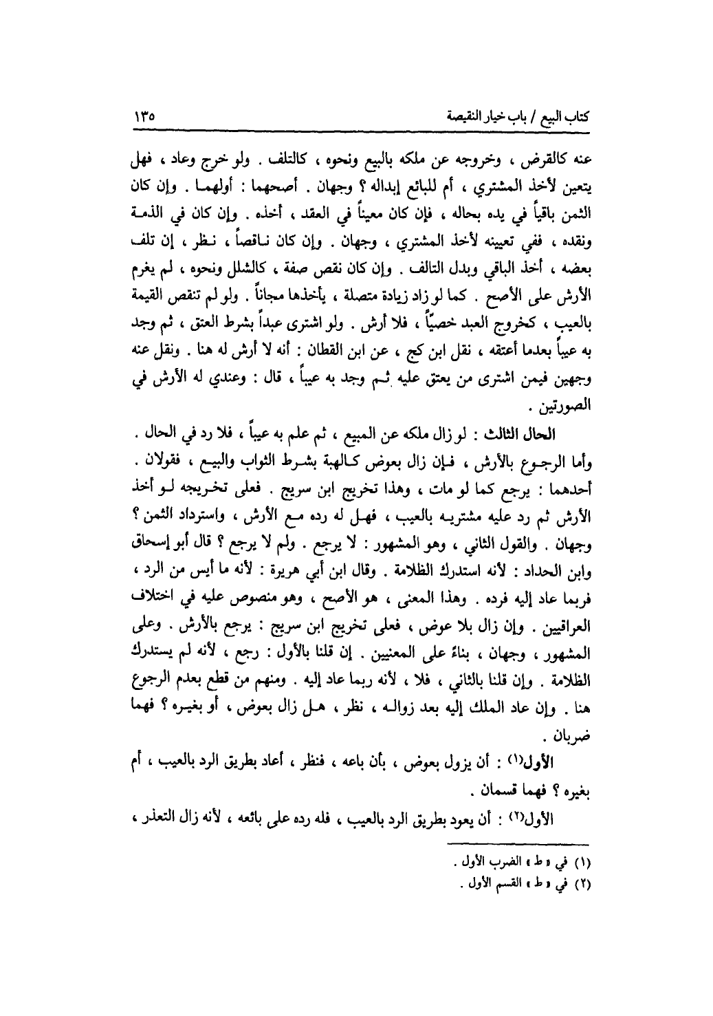 عنه كالقرض، وخروجه عن ملكه بالبيع ونحوه، كالتلف. ولو خرج وعاد، فهل يتعين لاخذ المشتري، أم للبائع إبداله ؟ وجهان. أصحهما: أولهما. وإن كان الثمن باقيا في يده بحاله، فإن كان معينا في العقد، أخذه. وإن كان في الذمة ونقده، ففي تعيينه لاخذ المشتري، وجهان. وإن كان ناقصا، نظر، إن تلف بعضه، أخذ الباقي وبدل التالف. وإن كان نقص صفة، كالشلل ونحوه، لم يغرم الارش على الاصح. كما لو زاد زيادة متصلة، يأخذها مجانا. ولو لم تنقص القيمة بالعيب، كخروج العبد خصيا، فلا أرش. ولو اشترى عبدا بشرط العتق، ثم وجد به عيبا بعدما أعتقه، نقل ابن كج، عن ابن القطان: أنه لا أرش له هنا. ونقل عنه وجهين فيمن اشترى من يعتق عليه ثم وجد به عيبا، قال: وعندي له الارش في الصورتين. الحال الثالث: لو زال ملكه عن المبيع، ثم علم به عيبا، فلا رد في الحال. وأما الرجوع بالارش، فإن زالال بعوض كالهبة بشرط الثواب والبيع، فقولان. أحدهما: يرجع كما لو مات، وهذا تخريج ابن سريج. فعلى تخريجه لو أخذ الارش ثم رد عليه مشتريه بالعيب، فهل له رده مع الارش، واسترداد الثمن ؟ وجهان. والقول الثاني، وهو المشهور: لا يرجع. ولم لا يرجع ؟ قال أبو إسحق وابن الحداد: لانه استدرك الظلامة. وقال ابن أبي هريرة: لانه ما أيس من الرد، فربما عاد إليه فرده. وهذا المعنى، هو الاصح، وهو منصوص عليه في اختلاف العراقيين. وإن زال بلا ع وض، فعلى تخريج ابن سريج: يرجع بالارش. وعلى المشهور، وجهان، بناء على المعنيين. إن قلنا بالاول: رجع، لانه لم يستدرك الظلامة. وإن قلنا بالثاني، فلا، لانه ربما عاد إليه. ومنهم من قطع بعدم الرجوع هنا. وإن عاد الملك إليه بعد زواله، نظر، هل زال بعوض، أم بغيره ؟ فهما ضرب. الضرب الاول: أن يزول بعوض، بأن باعه، فينظر، أعاد بطريق الرد بالعيب، أم بغيره ؟ فهما قسمان. الاول: أن يعود بطريق الرد بالعيب، فله رده على بائعه، لانه زال التعذر