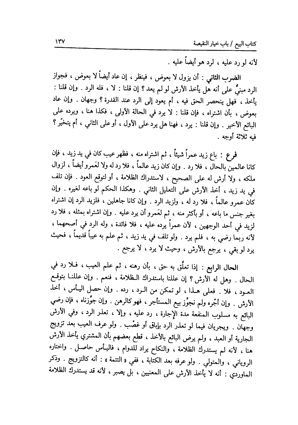 لانه لو رد عليه، لرد هو أيضا عليه. الضرب الثاني: أن يزول لا بعوض، فينظر، إن عاد أيضا لا بعوض، فجواز الرد مبني على أنه هل يأخذ الارش لو لم يعد ؟ إن قلنا: لا، فله الرد. وإن قلنا: يأخذ، فهل ينحصر الحق فيه، أم يعود إلى الرد عند القدرة ؟ وجهان. وإن عاد بع وض، بأن اشتراه، فإن قلنا: لا يرد في الحالة الاولى، فكذا هنا، ويرده على البائع الاخير. وإن قلنا: يرد، فهنا نل يرد على الاول، أو على الثاني، أم يتخير ؟ فيه ثلاثة أوجه. فرع باع زيد عمرا شيئا، ثم اشتراه منه، فظهر عيب كان في يد زيد، فإن كانا عالمين بالحال، فلا رد. وإن كان زيد عالما، فلا رد له ولا لعمرو أيضا، لزوال ملكه، ولا أرش له على الصحيح، لاستدراك الظلامة، أو لتوقع العود. فإن تلف في يد زيد، أخذ الارش على التعليل الثاني. وهكذا الحكم لو باعه لغيره. وإن كان عمرو عالما، فلا رد له، ولزيد الرد. وإن كانا جاهلين، فلزيد الرد إن اشتراه بغير جنس ما باعه، أو بأكثر منه، ثم لعمرو أن يرد عليه. وإن اشتراه بمثله، فلا رد لزيد في أحد الوجهين، لان عمرا يرده عليه، فلا فائدة، وله الرد في أصحهما، لانه ربما رضي به، فلم يرد. ولو تلف في يد زيد، ثم علم به عيبا قديما، فحيث يرد لو بقى، يرجع بالارش، وحيث لا يرد، لا يرجع. الحال الرابع: إذا تعلق به حق، بأن رهنه، ثم علم العيب، فلا رد في الحال وهل له الارش ؟ إن عللنا باستدراك الظلامة، فنعم. وإن عللنا بتوقع العود، فلا. فعلى هذا، لو تمكن من الرد، رده. وإن حصل اليأس، أخذ الارش. وإن أجره ولم نجوز بيع المستأجر، فهو كالرهن. وإن جوزناه، فإن رضي البائع به مسلوب المنفعة مدة الاجارة، رد عليه، وإلا، تعذر الرد، وفي الارش وجهان. ويجريان فيما لو تعذر الرد بإباق أو غصب. ولو عرف العيب بعد تزويج الجارية أو العبد، ولم يرض البائع بالاخذ، قطع بعضهم بأن المشتري يأخذ الارش هنا، لانه لم يستدرك الظلامة، والنكاح يراد للدوام، فاليأس حاصل. واختاره الروياني، والمتولي. ولو عرفه بعد الكتابة، ففي التتمة: أنه كالتزويج. وذكر الماوردي: أنه لا يأخذ الارش على المعنيين، بل يصبر، لانه قد يستدرك الظلامة