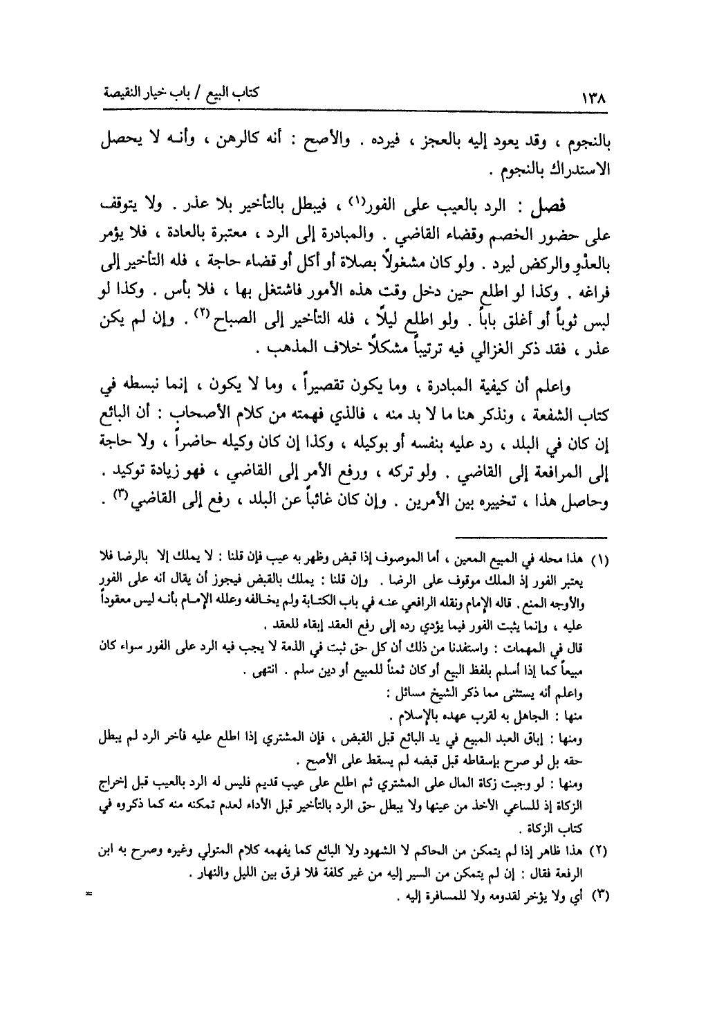 بالنجوم، وقد يعود إليه بالعجز، فيرده. والاصح أنه كالرهن، وأنه لا يحصل الاستدراك بالنجوم. فصل الرد بالعيب على الفور، فيبطل بالتأخير بلا عذر. ولا يتوقف على حضور الخصم وقضاء القاضي. والمبادرة إلى الرد، معتبرة بالعادة، فلا يؤمر بالعدو والركض ليرد. ولو كان مشغولا بصلاة أو أكل أو قضاء حاجة، فله التأخير إلى فراغه. وكذا لو اطلع حين دخل وقت هذه الامور فاشتغل بها، فلا بأس. وكذا لو لبس ثوبا أو أغلق بابا. ولو اطلع ليلا، فله التأخير إلى الصباح. وإن لم يكن عذر، فقد ذكر الغزالي فيه ترتيبا مشكلا خلاف المذهب. واعلم أن كيفية المبادرة، وما يكون تقصيرا، وما لا يكون، إنما نبسطه في كتاب الشفعة، ونذكر هنا ما لا بد منه، فالذي فهمته من كلام الاصحاب: أن البائع إن كان في البلد، رد عليه بنفسه أو بوكيله، وكذا إن كان وكيله حاضرا، ولا حاجة إلى المرافعة إلى القاضي. ولو تركه، ورفع الامر إلى القاضي، فهو زيادة توكيد. وحاصل هذا، تخييره بين الامرين. وإن كان غائبا عن البلد، رفع إلى القاضي.