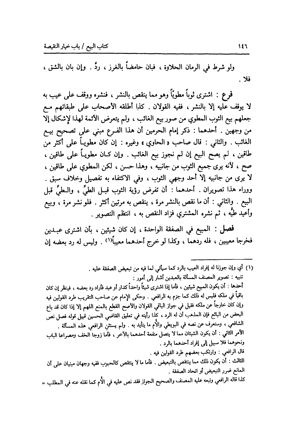 ولو شرط في الرمان الحلاوة، فبان حامضا بالغرز، رد. وإن بان بالشق، فلا. فرع اشترى ثوبا مطويا وهو مما ينقص بالنشر، فنشره ووقف على عيب به لا يوقف عليه إلا بالنشر، ففيه القولان. كذا أطلقه الاصحاب على طبقاتهم مع جعلهم بيع الثوب المطوي من صور بيع الغائب، ولم يتعرض الائمة لهذا الاشكال إلا من وجهين. أحدهما: ذكر إمام الحرمين أن هذا الفرع مبني على تصحيح بيع الغائب. والثاني: قال صاحب الحاوي وغيره: إن كان مطويا على أكثر من طاقين، لم يصح البيع إن لم نجوز بيع الغائب. وإن كان مطويا على طاقين، صح، لانه يرى جميع الثوب من جانبيه، وهذا حسن، لكن المطوي على طاقين، لا يرى من جانبيه إلا أحد وجهي الثوب، وفي الاكتفاء به تفصيل وخلاف سبق. ووراء هذا تصويران. أحدهما: أن تفرض رؤية الثوب قبل الطي، والطي قبل البيع. والثاني: أن ما نقص بالنشر مرة، ينقص به مرتين أو أكثر. فلو نشر مرة، وبيع وأعيد طيه، ثم نشره المشتري فزاد النقص به، انتظم التصوير.