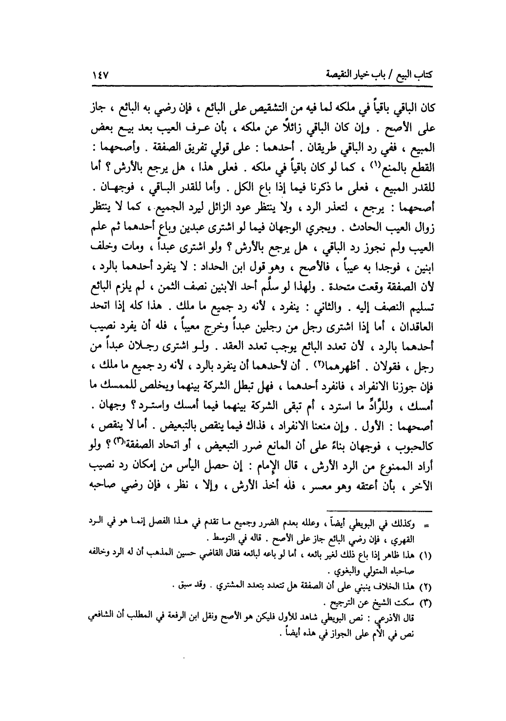 كان الباقي باقيا في ملكه، لما فيه من التشقيص على البائع، فإن رضي به البائع، جاز على الاصح. وإن كان الباقي زائلا عن ملكه، بأن عرف العيب بعد بيع بعض المبيع، ففي رد الباقي طريقان. أحدهما: على قولي تفريق الصفقة. وأصحهما: القطع بالمنع، كما لو كان باقيا في ملكه. فعلى هذا، هل يرجع بالارش ؟ أما للقدر المبيع، فعلى ما ذكرنا فيما إذا باع الكل. وأما للقدر الباقي، فوجهان أصحهما: يرجع، لتعذر الرد، ولا ينتظر عود الزائل ليرد الجميع، كما لا ينتظر زوال العيب الحادث. ويجري الوجهان فيما لو اشترى عبدين وباع أحدهما ثم علم العيب ولم نجوز رد الباقي، هل يرجع بالارش ؟ ولو اشترى عبدا، ومات وخلف ابنين، فوجدا به عيبا، فالاصح، وهو قول ابن الحداد: لا ينفرد أحدهما بالرد، لان الصفقة وقعت متحدة. ولهذا لو سلم أحد الابنين نصف الثمن، لم يلزم البائع تسليم النصف إليه. والثاني: ينفرد، لانه رد جميع ما ملك. هذا كله إذا اتحد العاقدان، أما إذا اشترى رجل من رجلين عبدا وخرج معيبا، فله أن يفرد نصيب أحدهما بالرد، لان تعدد البائع يوجب تعدد العقد. ولو اشترى رجلان عبدا من رجل فقولان. أظهرهما: أن لاحدهما أن ينفرد بالرد، لانه رد جميع ما ملك، فإن جوزنا الانفراد، فانفرد أحدهما، فهل تبطل الشركة بينهما ويخلص للممسك ما أمسك، وللراد ما استرد، أم تبقى الشركة بينهما فيما أمسك واسترد ؟ وجهان. أصحهما: الاول. وإن منعنا الانفراد، فذاك فيما ينقص بالتبعيض. أما ما لا ينقص، كالحبوب، فوجهان بناء على أن المانع ضرر التبعيض، أو اتحاد الصفقة ؟ ولو أراد الممنوع من الرد الارش، قال الامام: إن حصل اليأس من إمكان رد نصيب الآخر، بأن أعتقه وهو معسر، فله أخذ الارش، وإلا، نظر، فإن رضي صاحبه