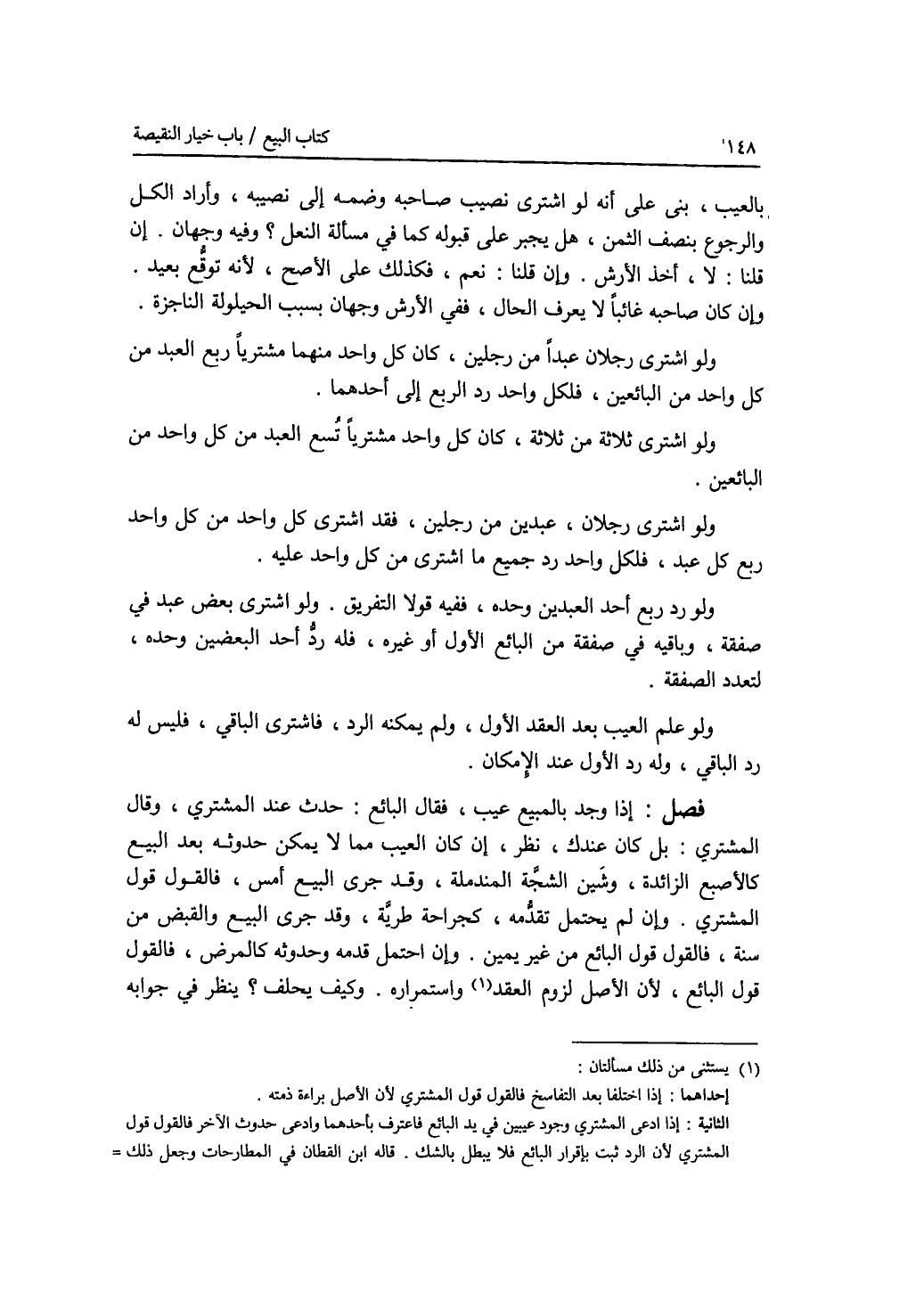 بالعيب، بني على أنه لو اشترى نصيب صاحبه وضمه إلى نصيبه، وأراد الكل والرجوع بنصف الثمن، هل يجبر على قبوله كما في مسألة النعل ؟ وفيه وجهان. إن قلنا: لا، أخذ الارش. وإن قلنا: نعم، فكذلك على الاصح، لانه توقع بعيد. وإن كان صاحبه غائبا لا يعرف الحال، ففي الارش وجهان بسبب الحيلولة الناجزة. ولو اشترى رجلان عبدا من رجلين، كان كل واحد منهما مشتريا ربع العبد من كل واحد من البائعين، فلكل واحد رد الربع إلى أحدهما. ولو اشترى ثلاثة من ثلاثة، كان كل واحد مشتريا تسع العبد من كل واحد من البائعين. ولو اشترى رجلان، عبدين من رجلين، فقد اشترى كل واحد من كل واحد ربع كل عبد، فلكل واحد رد جميع ما اشترى من كل واحد عليه. ولو رد ربع أحد العبدين وحده، ففيه قولا التفريق. ولو اشترى بعض عبد في صفقة، وباقيه في صفقة من البائع الاول أو غيره، فله رد أحد البعضين وحده، لتعدد الصفقة. ولو علم العيب بعد العقد الاول، ولم يمكنه الرد، فاشترى الباقي، فليس له رد الباقي، وله رد الاول عند الامكان.