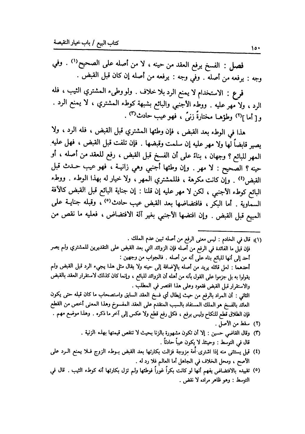 فصل الفسخ يرفع العقد من حينه، لا من أصله على الصحيح. وفي وجه: يرفعه من أصله. وفي وجه: يرفعه من أصله إن كان قبل القبض. فرع الاستخدام لا يمنع الرد بلا خلاف. ولو وطئ المشتري الثيب، فله الرد، ولا مهر عليه. ووطئ الاجنبي والبائع بشبهة كوطئ المشتري، لا يمنع الرد. وأما وطؤهما مختارة زنى، فهو عيب حادث. هذا في الوطئ بعد القبض، فإن وطئها المشتري قبل القبض، فله الرد، ولا يصير قابضا لها ولا مهر عليه إن سلمت وقبضها. فإن تلفت قبل القبض، فهل عليه المهر للبائع ؟ وجهان، بناء على أن الفسخ قبل القبض، رفع للعقد من أصله، أو حينه ؟ الصحيح: لا مهر. وإن وطئها أجنبي وهي زانية، فهو عيب حدث قبل القبض. وإن كانت مكرهة، فللمشتري المهر، ولا خيار له بهذا الوطئ. وطئ البائع كوطئ الاجنبي، لكن لا مهر عليه إن قلنا: إن جناية البائع قبل القبض كالآفة السماوية. أما البكر، فافتضاضها بعد القبض عيب حادث، وقبله جناية على المبيع قبل القبض. وإن افتضها الاجنبي بغير آلة الافتضاض، فعليه ما نقص من