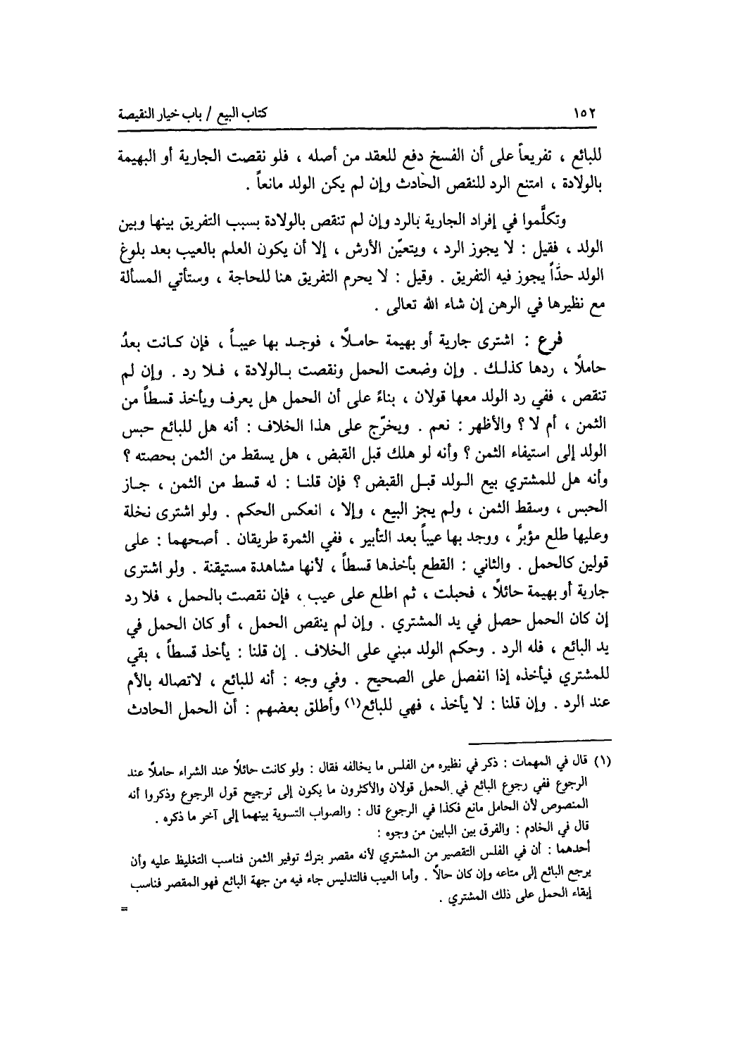 للبائع، تفريعا على أن الفسخ دفع للعقد من أصله. فلو نقصت الجارية أو البهيمة بالولادة، امتنع الرد للنقص الحادث وإن لم يكن الولد مانعا. وتكلموا في إفراد الجارية بالرد وإن لم تنقص بالولادة بسبب التفريق بينها وبين الولد، فقيل: لا يجوز الرد، ويتعين الارش، إلا أن يكون العلم بالعيب بعد بلوغ الولد حدا يجوز فيه التفريق. وقيل: لا يحرم التفريق هنا للحاجة، وستأتي المسألة مع نظيرها في الرهن إن شاء الله تعالى. فرع اشترى جارية أو بهيمة حاملا، فوجد بها عيبا، فإن كانت بعد حاملا، ردها كذلك. وإن وضعت الحمل ونقصت بالولادة، فلا رد. وإن لم تنقص، ففي رد الولد معها قولان، بناء على أن الحمل هل يعرف ويأخذ قسطا من الثمن، أم لا ؟ والاظهر: نعم. ويخرج على هذا الخلاف: أنه هل للبائع حبس الولد إلى استيفاء الثمن ؟ وأنه لو هلك قبل القبض، هل يسقط من الثمن بحصته ؟ وأنه هل للمشتري بيع الولد قبل القبض ؟ فإن قلنا: له قسط من الثمن، جاز الحبس، وسقط الثمن، ولم يجز البيع، وإلا، انعكس الحكم. ولو اشترى نخلة وعليها طلع مؤبر، ووجد بها عيبا بعد التأبير، ففي الثمرة طريقان. أصحهما: على قولين كالحمل. والثاني: القطع بأخذها قسطا، لانها مشاهدة مستيقنة. ولو اشترى جارية أو بهيمة حائلا، فحبلت، ثم اطلع على عيب، فإن نقصت بالحمل، فلا رد إن كان الحمل حصل في يد المشتري. وإن لم ينقص الحمل، أو كان الحمل في يد البائع، فله الرد. وحكم الولد مبنى على الخلاف. إن قلنا: يأخذ قسطا، بقي للمشتري فيأخذه إذا انفصل على الصحيح. وفي وجه: أنه للبائع، لاتصاله بالام عند الرد. وإن قلنا: لا يأخذ، فهي للبائع. وأطلق بعضهم: أن الحمل الحادث