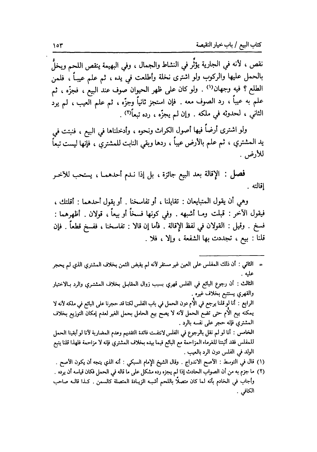 نقص، لانه في الجارية يؤثر في النشاط والجمال، وفي البهيمة ينقص اللحم ويخل بالحمل عليها والركوب. ولو اشترى نخلة وأطلعت في يده، ثم علم عيبا، فلمن الطلع ؟ فيه وجهان. ولو كان على ظهر الحيوان صوف عند البيع، فجزه، ثم علم به عيبا، رد الصوف معه. فإن استجز ثانيا وجزه، ثم علم العيب، لم يرد الثاني، لحدوثه في ملكه. وإن لم يجزه، رده تبعا. ولو اشترى أرضا فيها أصول الكراث ونحوه، وأدخلناها في البيع، فنبتت في يد المشتري، ثم علم بالارض عيبا، ردها وبقي النابت للمشتري، فإنها ليست تبعا للارض.