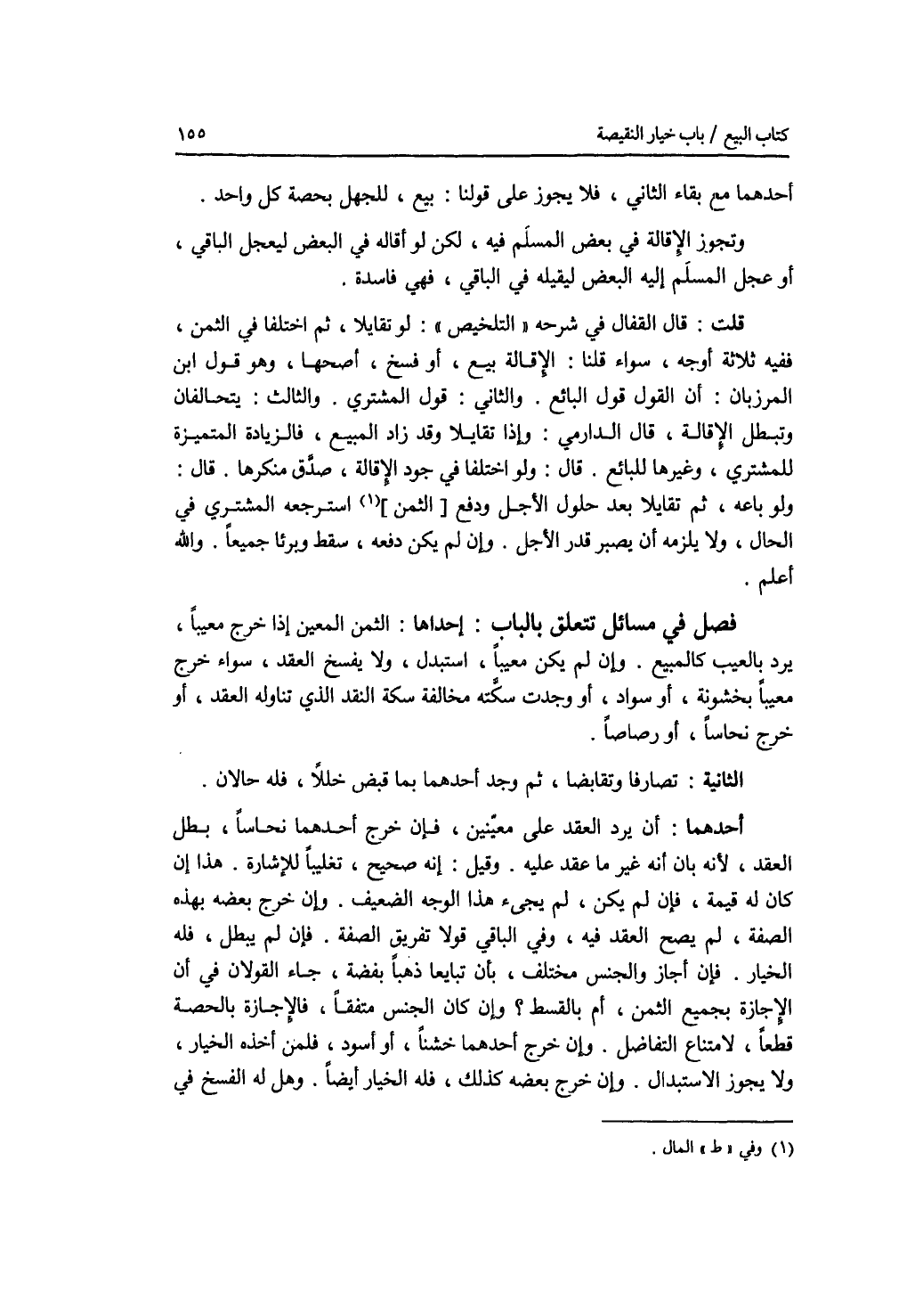 فصل في مسائل تتعلق بالباب إحداها: الثمن المعين إذا خرج معيبا، يرد بالعيب كالمبيع. وإن لم يكن معيبا، استبدل، ولا يفسخ العقد، سواء خرج معيبا بخشونة، أو سواد، أو وجدت سكته مخالفة سكة النقد الذي تناوله العقد، أو خرج نحاسا، أو رصاصا. الثانية: تصارفا وتقابضا، ثم وجد أحدهما بما قبض خللا، فله حالان. أحدهما: أن يرد العقد على معينين فإن خرج أحدهما نحاسا، بطل العقد، لانه بان أنه غير ما عقد عليه. وقيل: إنه صحيح، تغليبا للاشارة. هذا إن كان له قيمة، فإن لم يكن، لم يجئ هذا الوجه الضعيف. وإن خرج بعضه بهذه الصفة، لم يصح العقد فيه، وفي الباقي قولا تفريق الصفة. فإن لم يبطل، فله الخيار. فإن أجاز والجنس مختلف، بأن تبايعا ذهبا بفضة، جاء القولان في أن الاجازة بجميع الثمن، أم بالقسط ؟ وإن كان الجنس متفقا، فالاجازة الحصة قطعا، لامتناع التفاضل. وإن خرج أحدهم خشبا، فلمن أخذه الخيار، ولا يجوز الاستبدال وإن خرج بعضه كذلك، فله الخيار أيضا. وهل له الفسخ في