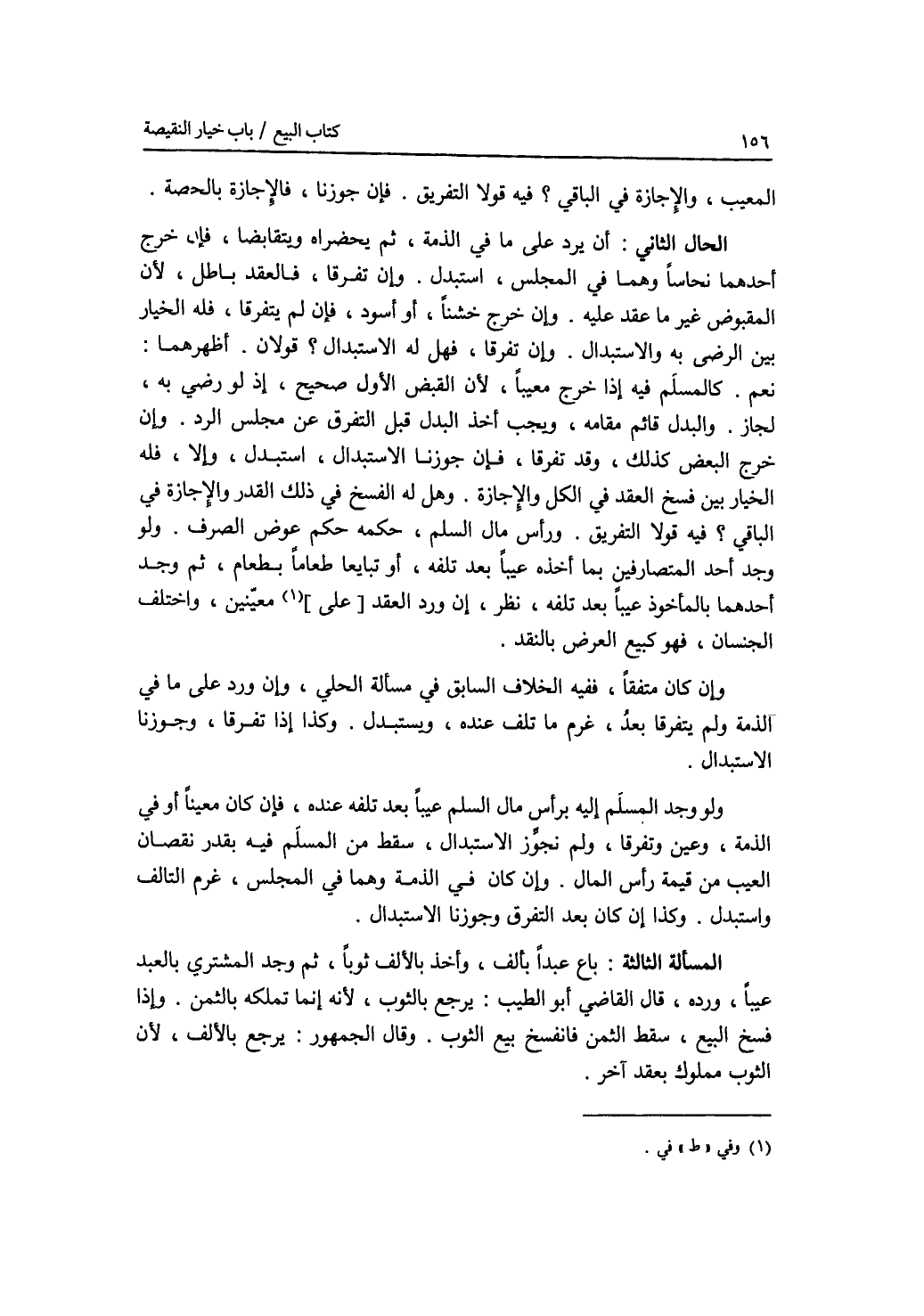 المعيب، والاجازة في الباقي ؟ فيه قولا التفريق. فإن جوزنا، فالاجازة بالحصة. الحال الثاني: أن يرد عى ما في الذمة، ثم يحضراه ويتقابضا، فإن خرج أحدهما نحاسا وهما في المجلس، استبدل. وإن تفرقا، فالعقد باطل، لان المقبوض غير ما عقد عليه. وإن خرج خشنا، أو أسود، فإن لم يتفرقا، فله الخيار بين الرضى به والاستبدال وأن تفرقا، فهل له الاستبدال ؟ قولان. أظهرهما: نعم. كالمسلم فيه إذا خرج معيبا، لان القبض الاول صحيح، إذ لو رضي به، لجاز. والبدل قائم مقامه، ويجب أخذ البدل قبل التفرق عن مجلس الرد. وإن خرج البعض كذلك، وقد تفرقا، فإن جوزنا الاستبدال، استبدل، وإلا، فله الخيار بين فسخ العقد في الكل والاجازة. وهل له الفسخ في ذلك القدر والاجازة في الباقي ؟ فيه قولا التفريق. ورأس مال السلم، حكمه حكم عوض الصرف. ولو وجد أحد المتصارفين بما أخذه عيبا بعد تلفه، أو تبايعا طعاما بطعام، ثم وجد أحدهما بالمأخوذ عيبا بعد تلفه، نظر، وإن ورد العقد في معينين، واختلف الجنسان، فهو كبيع العرض بالنقد. وإن كان متفقا، ففيه الخلاف السابق في مسألة الحلي. وإن ورد على ما في الذمة ولم يتفرقا بعد، غرم ما تلف عنده، ويستبدل. وكذا إن تفرقا، وجوزنا الاستبدال. ولو وجد المسلم إليه برأس مال السلم عيبا بعد تلفه عنده، فإن كان معينا أو في الذمة، وعين وتفرقا، ولم نجوز الاستبدال، سقط من المسلم فيه بقدر نقصان العيب من قيمة رأس المال. وإن كان في الذمة وهما في المجلس، غرم التالف واستبدل. وكذا إن كان بعد التفرق وجوزنا الاستبدال. المسألة الثالثة: باع عبدا بألف، وأخذ بالالف ثوبا، ثم وجد المشتري بالعبد عيبا، ورده، قال القاضي أبو الطيب: يرجع بالثوب، لانه إنما تملكه بالثمن. وإذا فسخ البيع، سقط الثمن فانفسخ بيع الثوب. وقال الجمهور: يرجع بالالف، لان الثوب مملوك بعقد آخر.