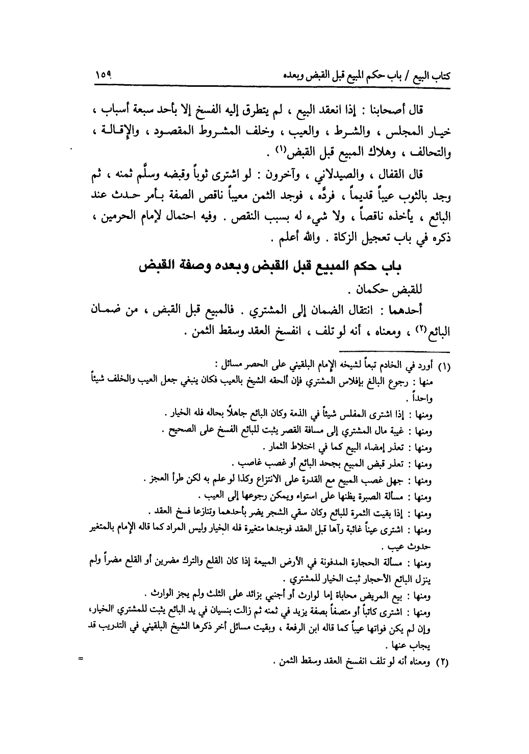 باب حكم المبيع قبل القبض وبعده وصفة القبض للقبض حكمان. أحدهما: انتقال الضمان إلى المشتري. فالمبيع قبل القبض، من ضمان البائع، ومعناه، أنه لو تلف، انفسخ العقد وسقط الثمن.