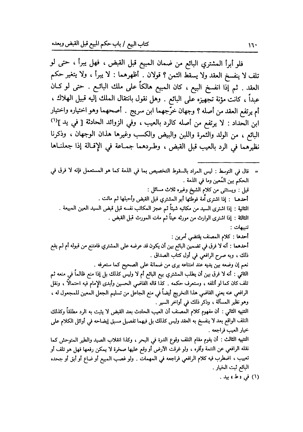 فلو أبرأ المشتري البائع من ضمان المبيع قبل القبض، فهل يبرأ، حتى لو تلف لا ينفسخ العقد ولا يسقط الثمن ؟ قولان. أظهرهما: لا يبرأ، ولا يتغير حكم العقد. ثم إذا انفسخ البيع، كان المبيع هالكا على ملك البائع. حتى لو كان عبدا، كانت مؤنة تجهيزه على البائع. وهل نقول بانتقال الملك إليه قبيل الهلاك، أم يرتفع العقد من أصله ؟ وجهان خرجهما ابن سريج. أصحهما وهو اختياره واختيار ابن الحداد: لا يرتفع من أصله كالرد بالعيب، وفي الزوائد الحادثة بيد البائع، من الولد والثمرة واللبن والبيض والكسب وغيرها هذان الوجهان، وذكرنا نظيرهما في الرد بالعيب قبل القبض، وطردهما جماعة في الاقالة إذا جعلناها