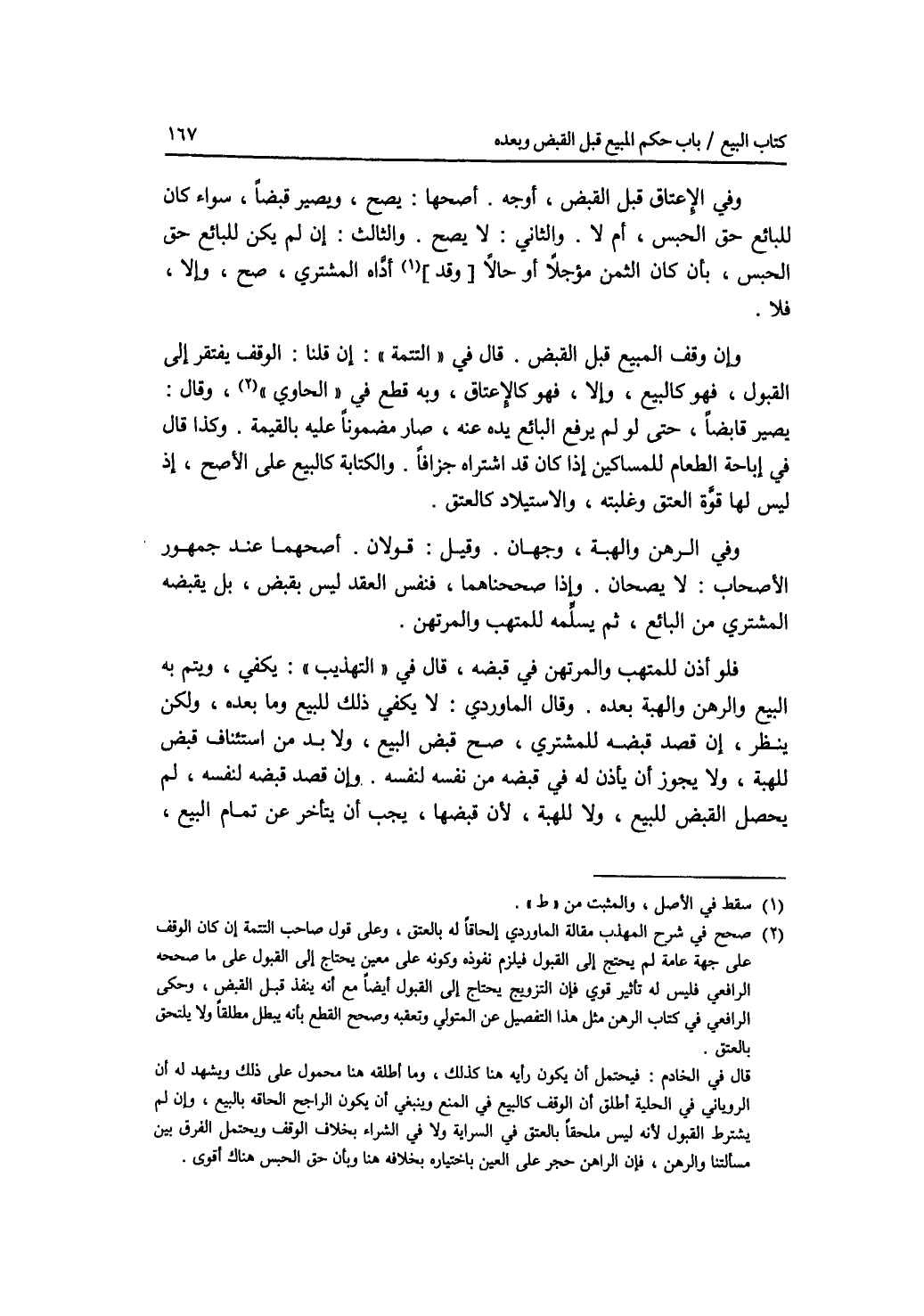 وفي الاعتاق قبل القبض أوجه. أصحها: يصح، ويصير قبضا، سواء كان للبائع حق الحبس، أم لا. والثاني: لا يصح. والثالث: إن لم يكن للبائع حق الحبس، بأن كان الثمن مؤجلا أو حالا وقد أداه المشتري، صح، وإلا، فلا. وإن وقف المبيع قبل القبض. قال في التتمة: إن قلنا: الوقف يفتقر إلى القبول، فهو كالبيع، وإلا، فهو كالاعتاق، وبه قطع في الحاوي، وقال: يصير قابضا، حتى لو لم يرفع البائع يده عنه، صار مضمونا عليه بدلقيمة. وكذا قال في إباحة الطعام للمساكين إذا كان قد اشتراه جزافا. والكتابة كالبيع على الاصح، إذ ليس لها قوة العتق وغلبته، والاستيلاد كالعتق. وفي الرهن والهبة، وجهان. وقيل: قولان. أصحهما عند جمهور الاصحاب: لا يصحان. وإذا صححناهما، فنفس العقد ليس بقبض، بل يقبضه المشتري من البائع، ثم يسلمه للمتهب والمرتهن. فلو أذن للمتهب والمرتهن في قبضه، قال في التهذيب: يكفي، ويتم به البيع والرهن والهبة بعده. وقال الماوردي: لا يكفي ذلك للبيع وما بعده، ولكن ينظر، إن قصد قبضه للمشتري، صح قبض البيع، ولا بد من استئناف قبض للهبة، ولا يجوز أن يأذن له في قبضه من نفسه لنفسه. وإن قصد قبضه لنفسه، لم يحصل القبض للبيع، ولا للهبة، لان قبضها، يجب أن يتأخر عن تمام البيع.